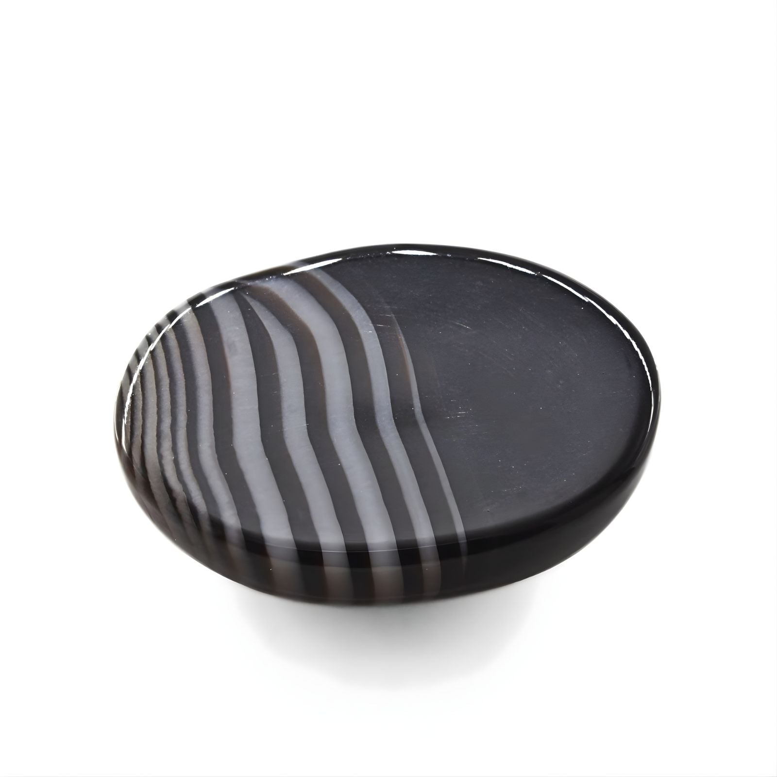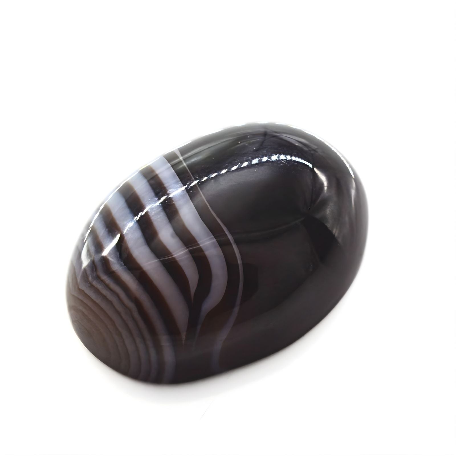 This 12.7-carat Sulemani Hakik exemplifies the finest qualities of natural banded agate, featuring rich black and grey striations in an elegant oval form. Formed through ancient geological processes, each band represents distinct mineral compositions layered over time. The oval cut showcases the stone's intricate patterns while providing optimal visual depth and brilliance. Recognized in traditional practices for its grounding and stabilizing properties, Sulemani Hakik remains a sought-after gemstone among connoisseurs. The untreated nature of this specimen preserves its authentic character and natural beauty. An exceptional choice for collectors valuing genuine, unaltered minerals with both visual distinction and historical significance.