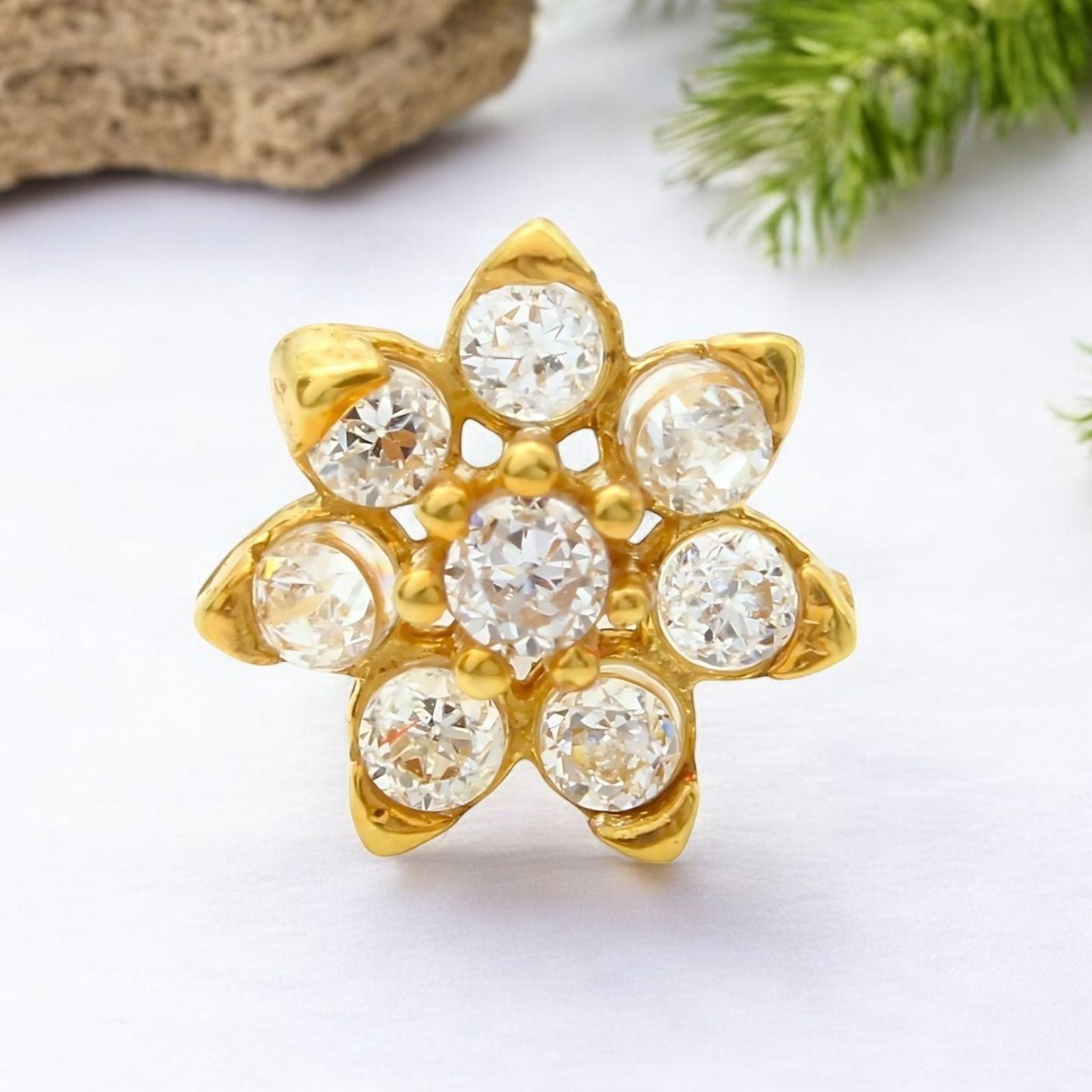 Crafted from 18K real gold, this delicate flower-shaped nose pin features premium white cubic zirconia stones for subtle elegance. The secure push pin design ensures comfortable all-day wear while maintaining its position. Perfect for both everyday sophistication and special occasions, this high-quality nose ring combines traditional craftsmanship with contemporary style.