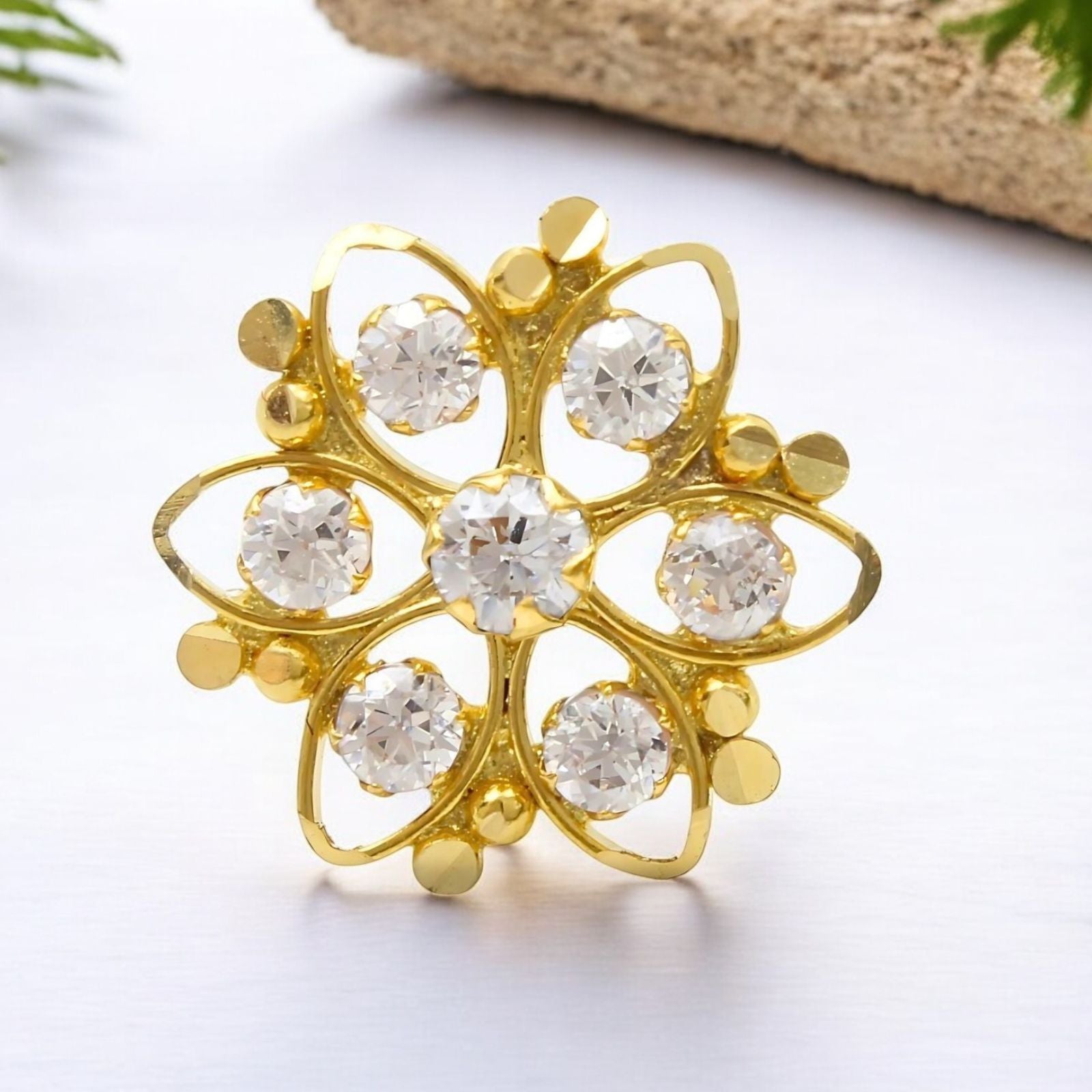 Elegantly crafted 18K real gold nose pin featuring a delicate white CZ flower design. This push pin style nose ring combines traditional craftsmanship with contemporary aesthetics, offering secure wear and brilliant sparkle. The premium materials ensure durability while maintaining a lightweight feel for comfortable daily use.