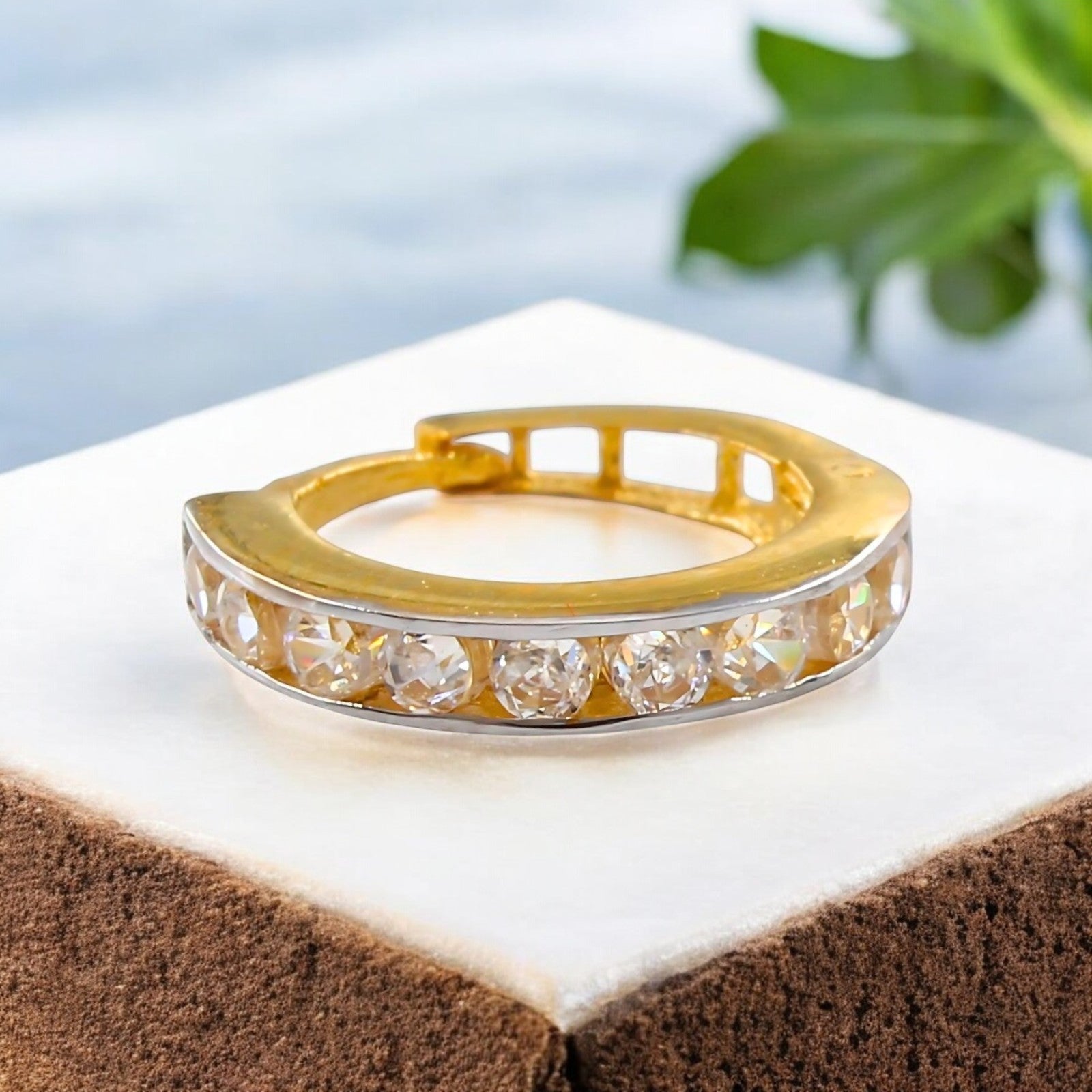 This 18K real gold nose ring features a sleek white cubic zirconia (CZ) clicker design, crafted for both elegance and durability. Weighing 20g, it offers a comfortable fit with secure closure, making it ideal for everyday wear or special occasions. Its high-quality materials ensure lasting shine and hypoallergenic comfort, perfect for those seeking a refined and reliable nose hoop.