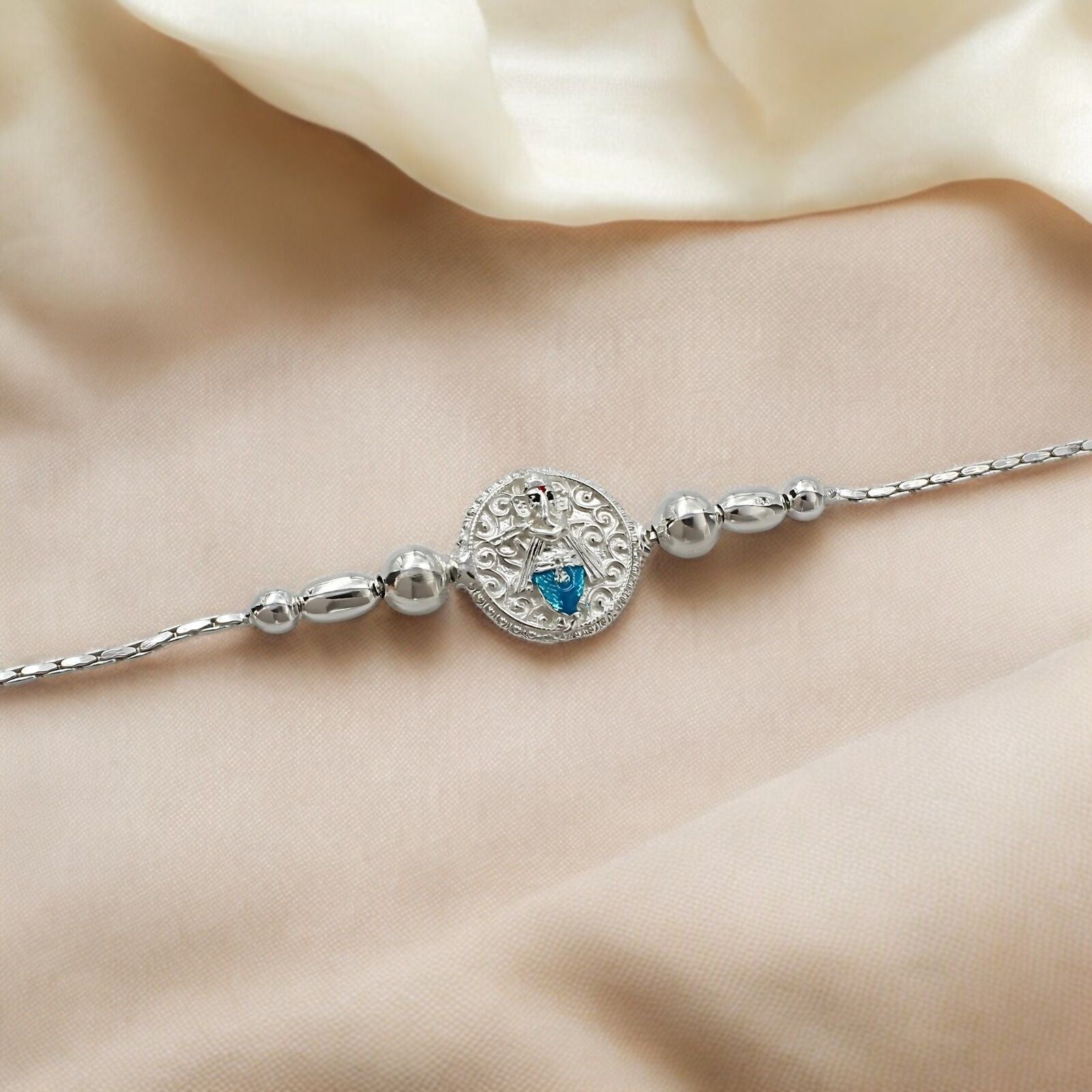 This 7.8-inch Rakhi bracelet features an expertly crafted Lord Ganesha motif, made from genuine 925 real silver. Combining spiritual significance with superior craftsmanship, it offers a durable and elegant way to celebrate the sacred bond of Raksha Bandhan. Ideal for those who appreciate both tradition and quality in their festive accessories.