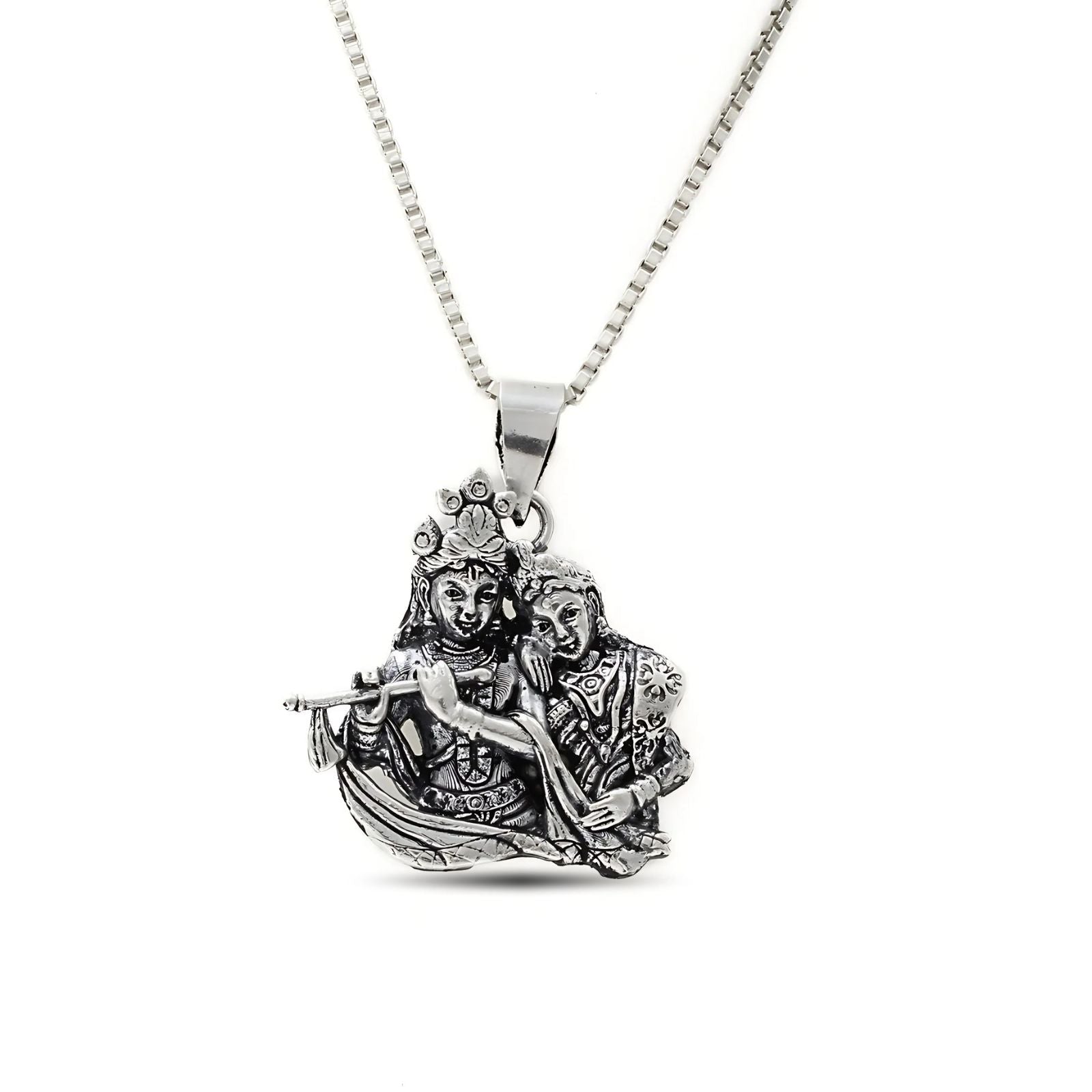 This 925 sterling silver pendant features an oxidized finish that beautifully captures the divine figures of Lord Radha and Krishna. Expertly crafted, it combines traditional artistry with durable materials, offering a sophisticated piece that symbolizes love and devotion. Ideal for those seeking meaningful spiritual jewelry with lasting elegance.