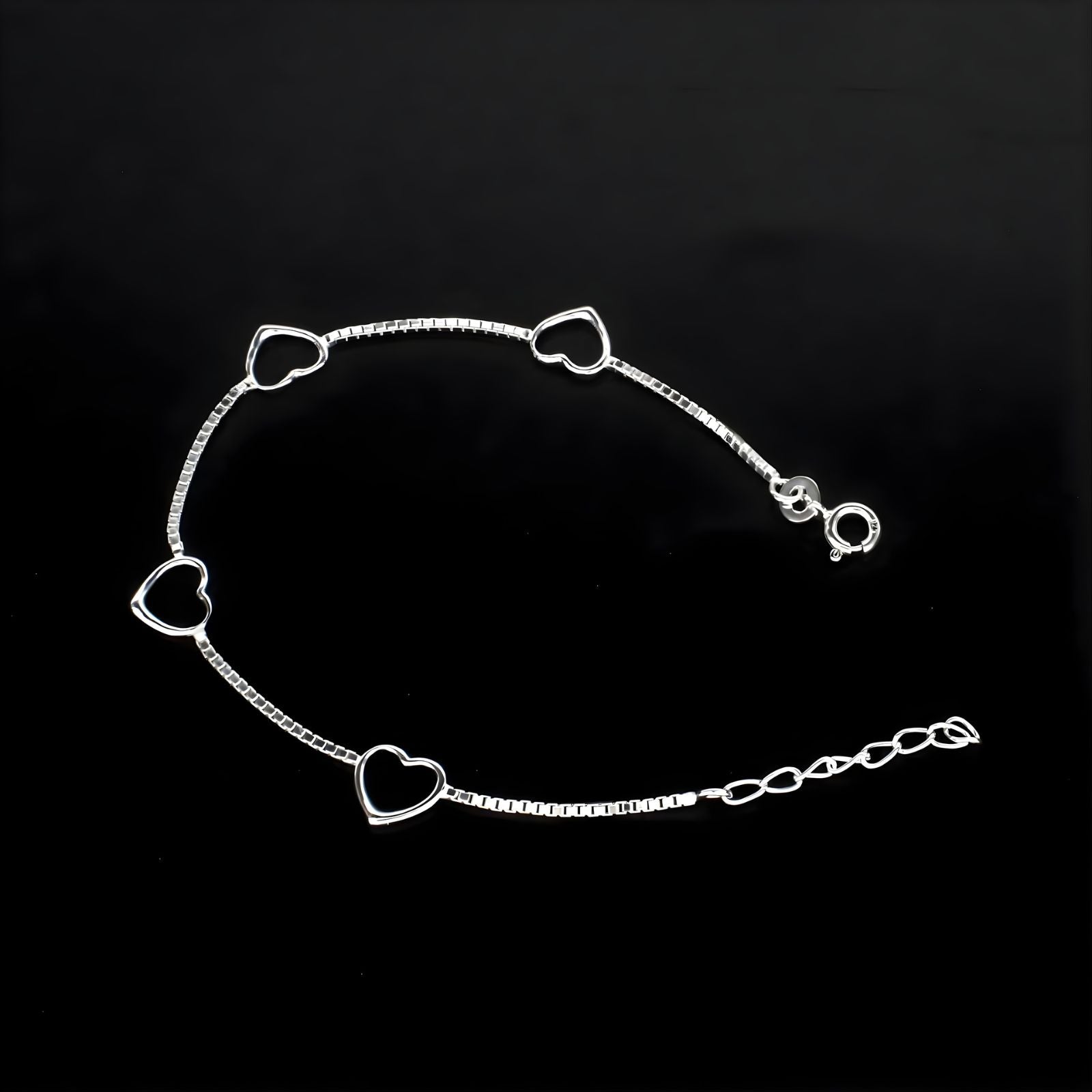 This sterling silver bracelet showcases divine heart charms suspended from a refined box chain, creating an understated yet meaningful accessory. Constructed from 925 sterling silver, it delivers lasting quality and a lustrous finish. The heart motif carries symbolic significance while maintaining an elegant, wearable aesthetic suitable for daily occasions or layering. An excellent choice for those seeking jewelry that balances sentimental value with sophisticated craftsmanship.