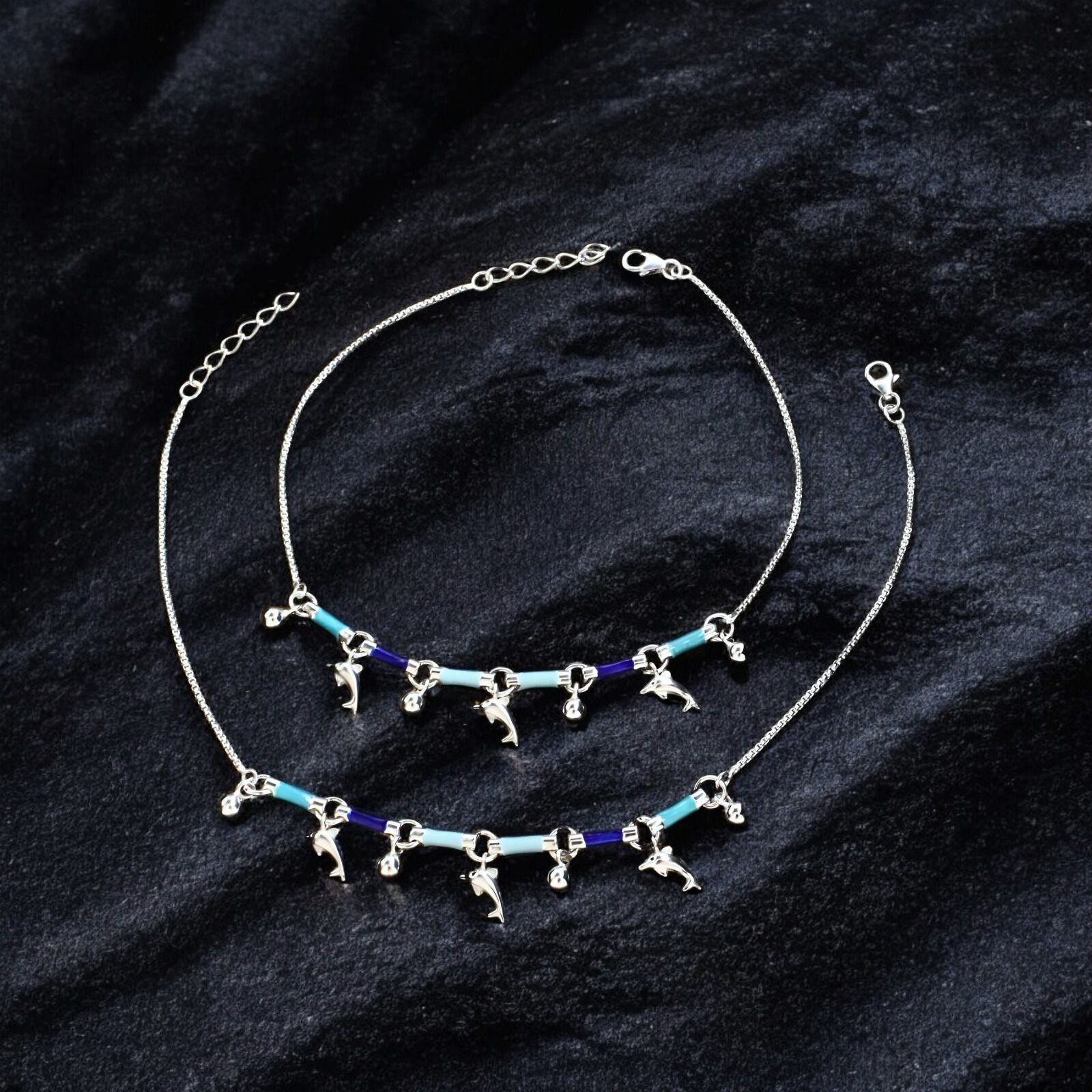 Elevate your ankle jewelry collection with this exquisite pair of 925 sterling silver anklets, each measuring 10.4 inches. Featuring delicate dangle dolphin charms, these payals blend traditional craftsmanship with contemporary design. The pure sterling silver ensures durability and a lustrous finish that complements any occasion, from casual wear to festive celebrations. Perfect for gifting or personal indulgence, these charming anklets capture the grace and playfulness of dolphins while maintaining the sophistication expected from fine jewelry. An ideal choice for those who appreciate meaningful, artfully crafted accessories.