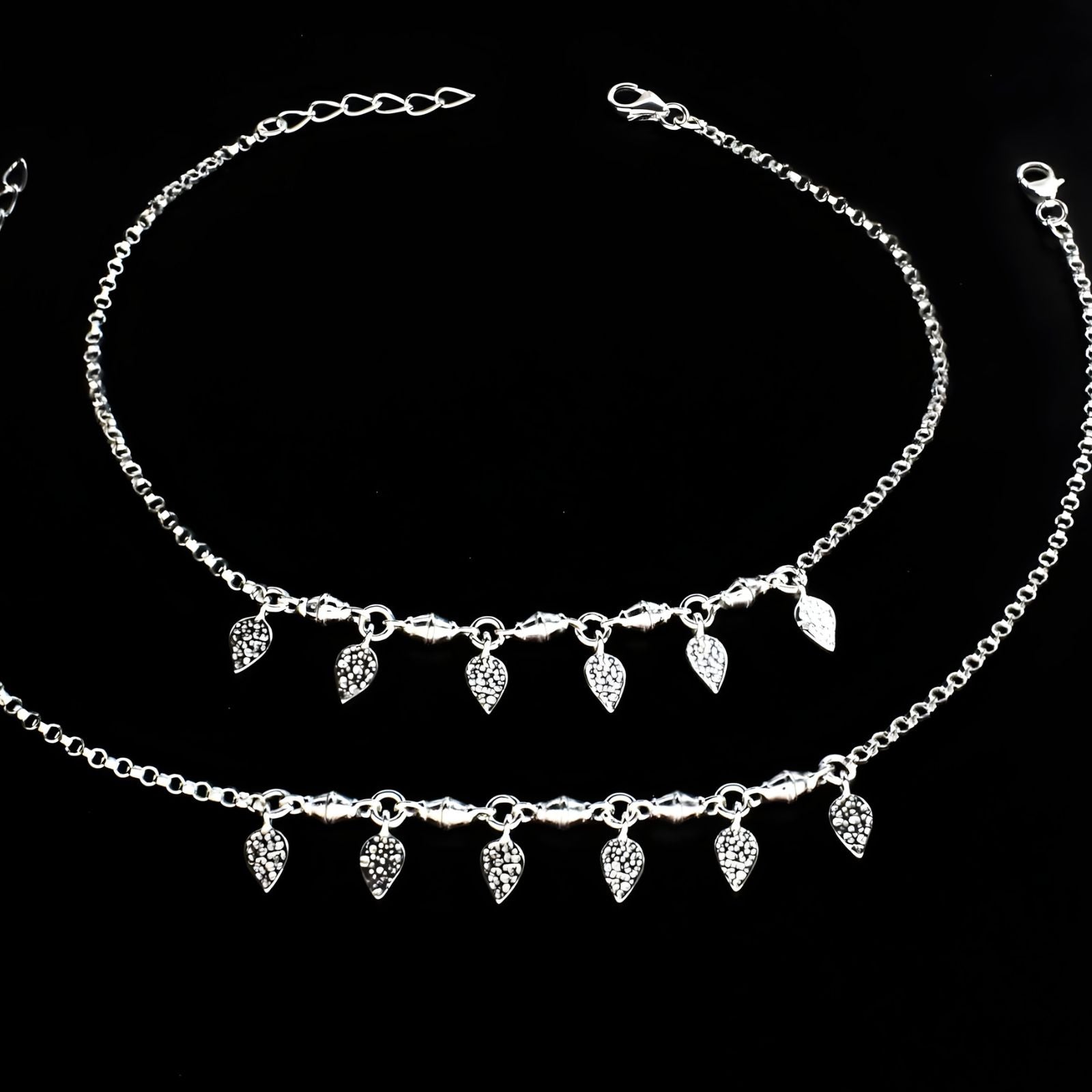 Discover nature-inspired elegance with this distinctive sterling silver anklet pair, each measuring 10.5 inches and featuring graceful leaf charm dangles. Crafted from premium 925 sterling silver, these anklets showcase a unique botanical aesthetic that appeals to those with refined taste and appreciation for natural motifs. The delicate leaf charms move fluidly along the chain, creating an enchanting visual effect with every movement. The combination of sterling silver's lustrous finish and the organic leaf design produces a sophisticated yet approachable look suitable for various occasions. Hypoallergenic and durable, these anklets withstand daily wear while maintaining their elegant appearance. An ideal choice for nature enthusiasts or anyone seeking jewelry that balances contemporary style with timeless charm.