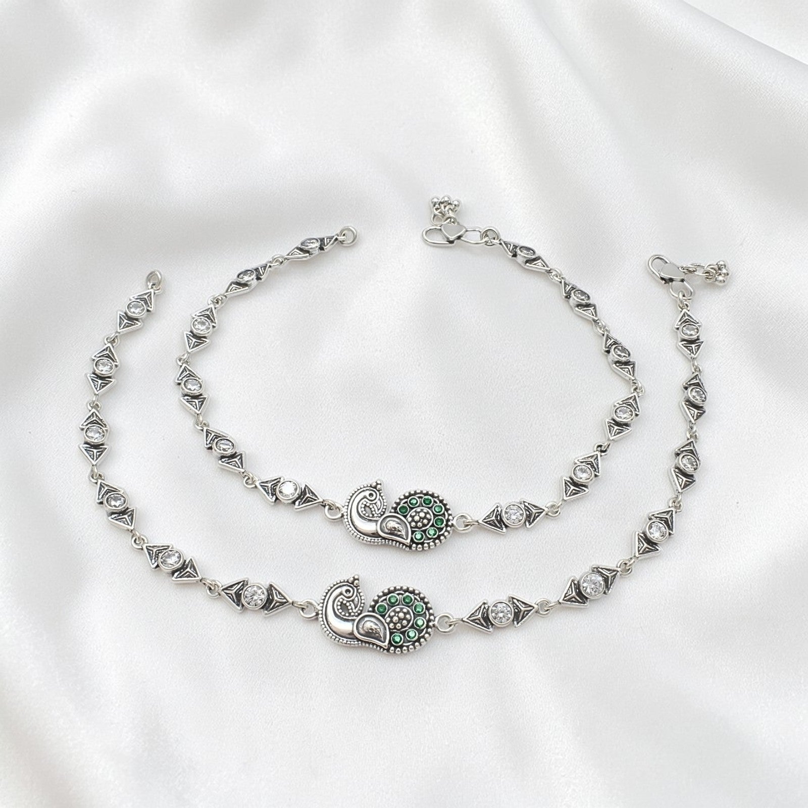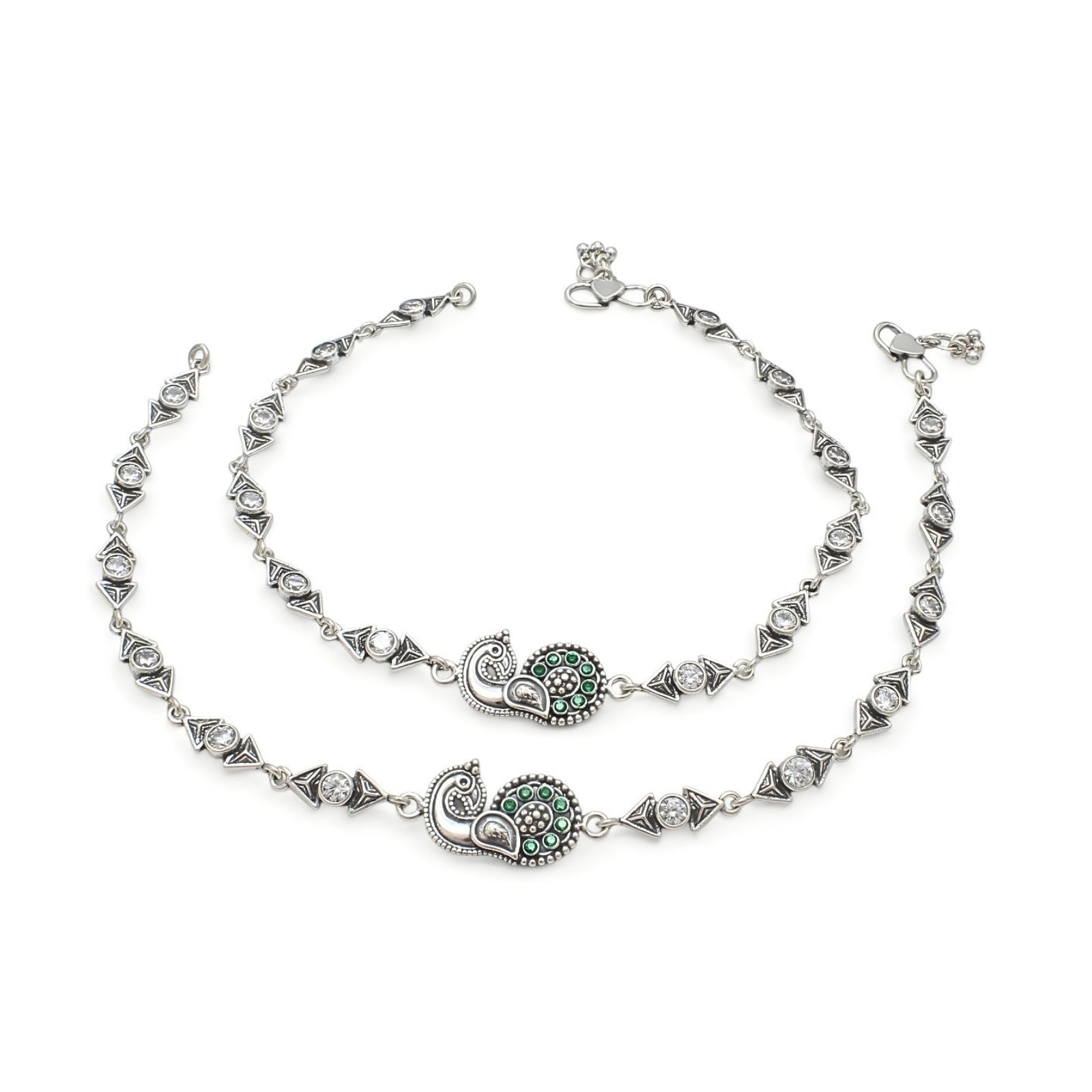 925 Sterling Silver Green White CZ Oxidised Peacock design Jhanjhar Anklet Pair 10"
