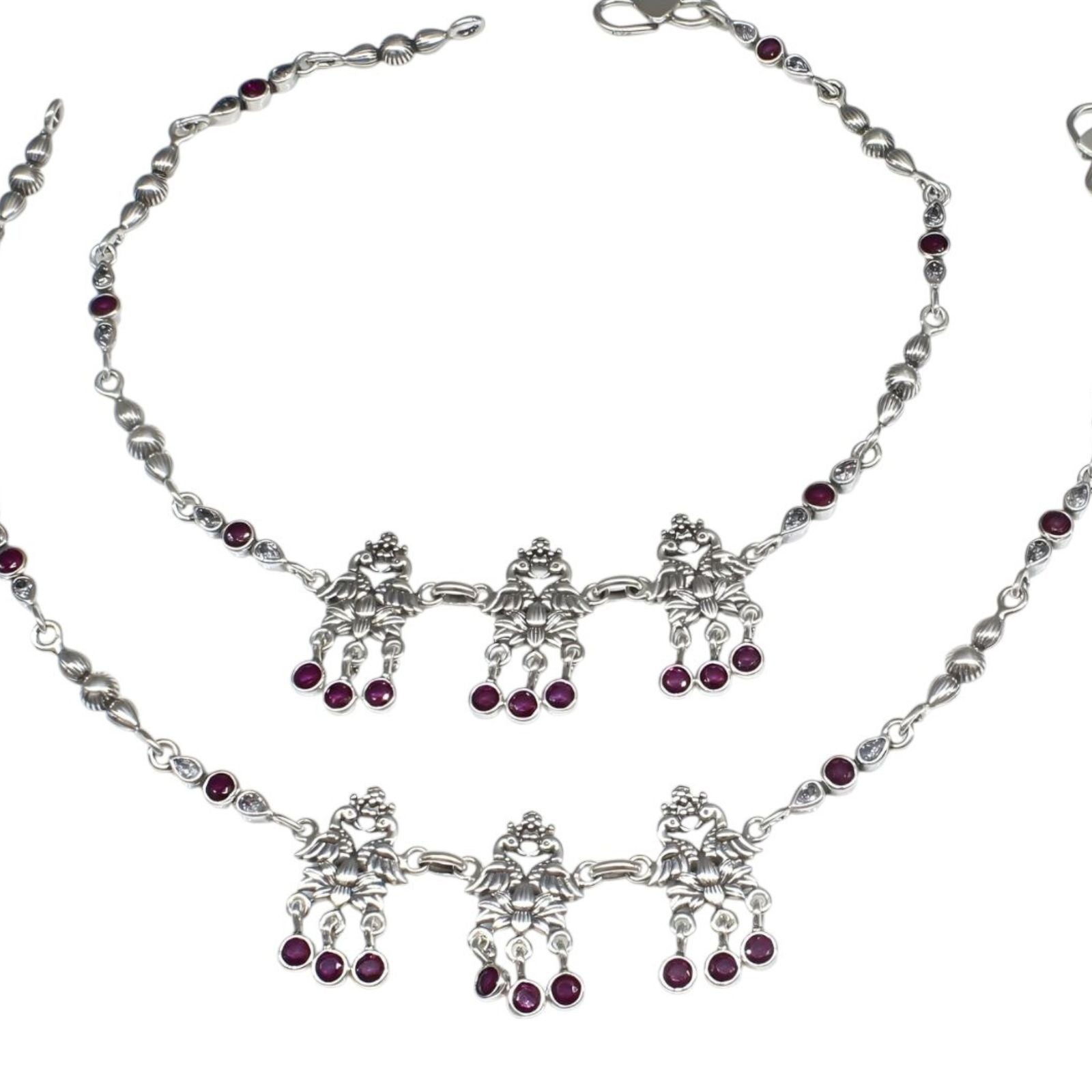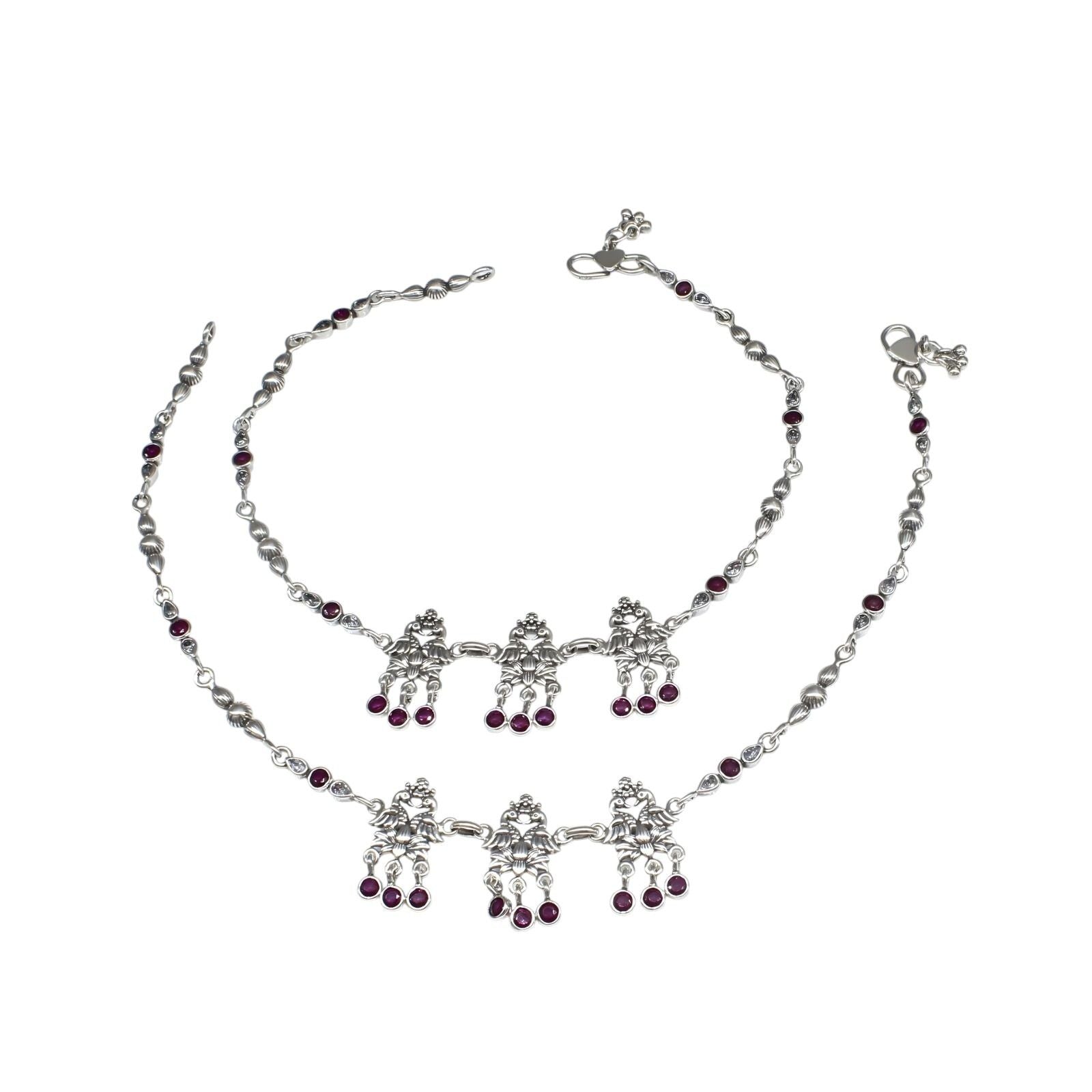 Divine 925 Sterling Silver Pink White CZ Oxidized women peacock Anklet Pair 10.5"
