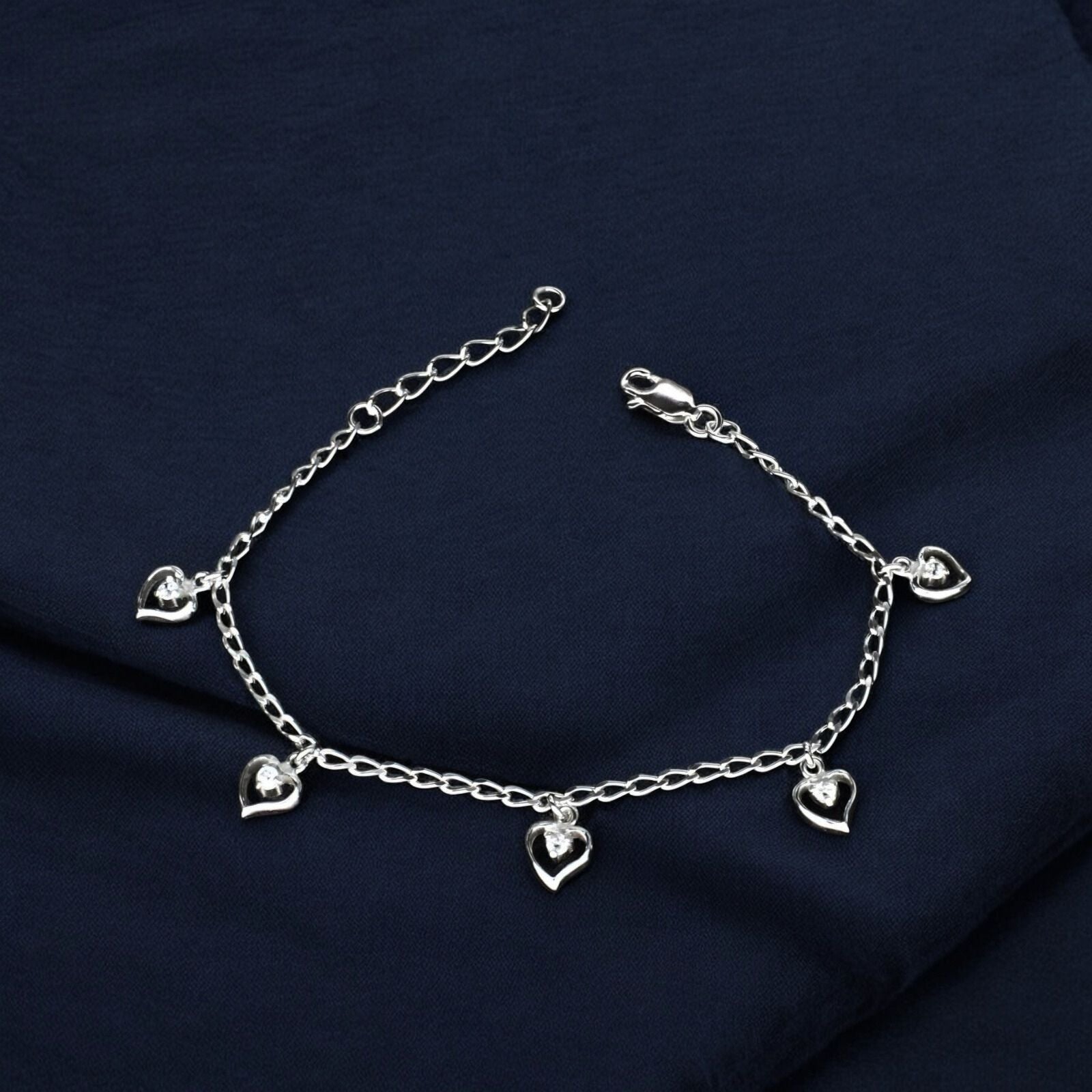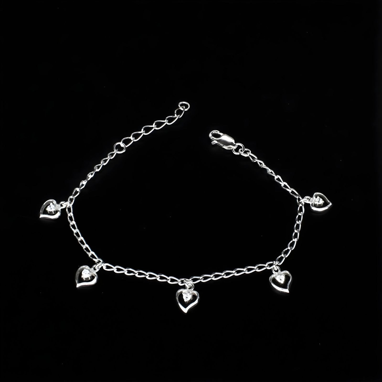 This exquisite bracelet showcases five heart charms adorned with brilliant white cubic zirconia, suspended from a sturdy curb chain crafted in authentic 925 sterling silver. The heart motifs symbolize affection and elegance, while the sparkling CZ stones catch light beautifully for added radiance. The robust curb chain design ensures longevity and reliable wear, resisting stretching and damage. Sterling silver's hypoallergenic properties make it ideal for sensitive skin. Whether worn as a meaningful gift or personal treasure, this bracelet delivers sophisticated charm with lasting brilliance and refined craftsmanship.
