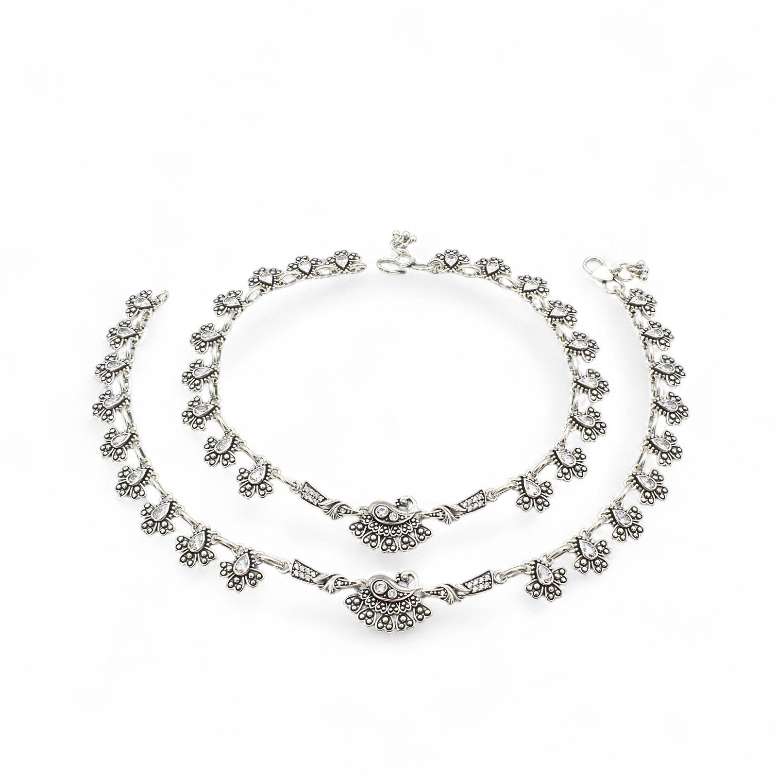 925 Sterling Silver Women Peacock White CZ Oxidised Jhanjhar Anklet Pair 10.3"