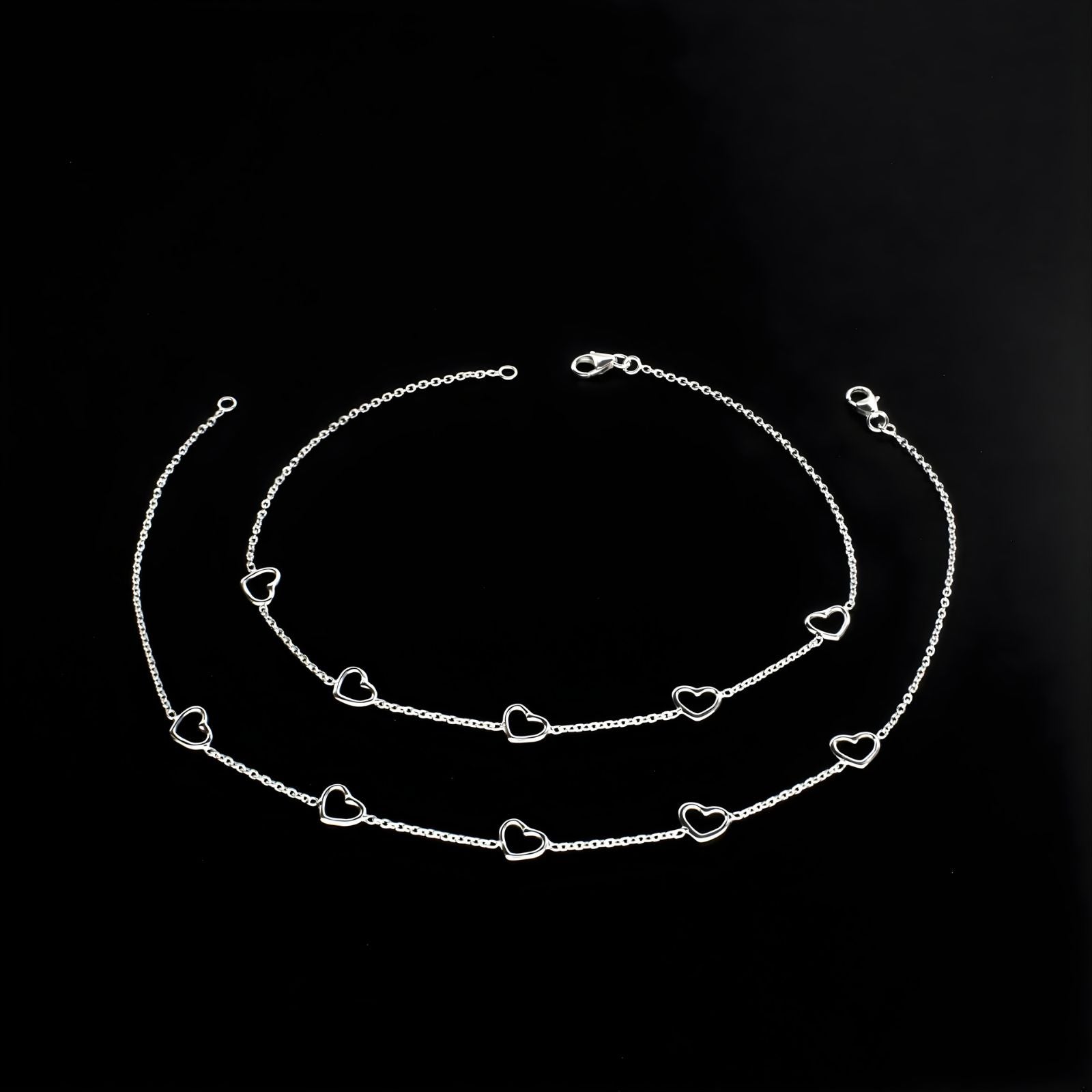 Make a romantic statement with this trendy sterling silver anklet pair, featuring five charming hearts elegantly spaced along a 10.3-inch chain. Constructed from authentic 925 sterling silver, these anklets blend contemporary style with sentimental appeal, perfect for expressing affection or celebrating meaningful relationships. The five-heart design creates a balanced, eye-catching composition that catches light beautifully while remaining understated enough for everyday wear. Sterling silver's inherent durability ensures these pieces withstand regular use without compromising their lustrous finish or structural integrity. Hypoallergenic and skin-friendly, they suit all wearers comfortably. Whether gifted to someone special or kept as a personal treasure, this anklet pair captures modern romance while maintaining the timeless elegance that defines quality jewelry.