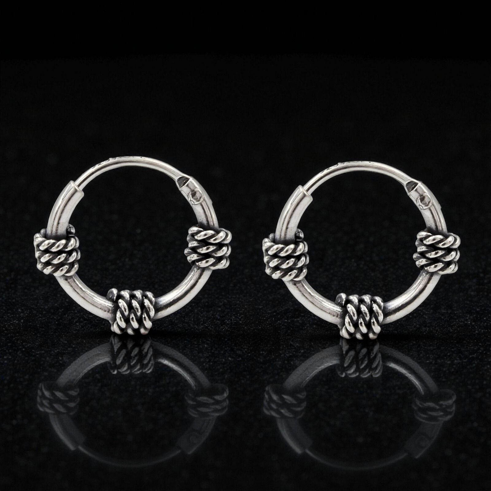 These mini Bali hoop earrings showcase authentic 925 sterling silver with an intricate rope design and oxidized finish. The textured rope pattern creates dimensional sophistication while the darkened patina enhances the traditional Balinese craftsmanship with refined character. The miniature scale offers exceptional versatility—perfect for layering, everyday elegance, or those preferring delicate jewelry statements. The oxidized surface beautifully showcases the rope detailing through subtle light and shadow interplay. Engineered for comfort and durability, the secure hoop construction ensures reliable stability throughout extended wear. An excellent selection for discerning jewelry enthusiasts who value authentic artisanal quality, premium materials, and the understated elegance that comes from masterfully executed miniature design.
