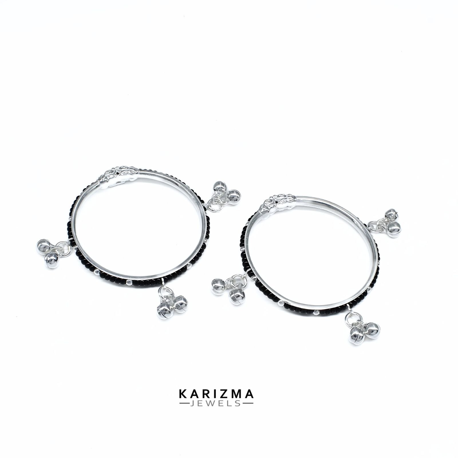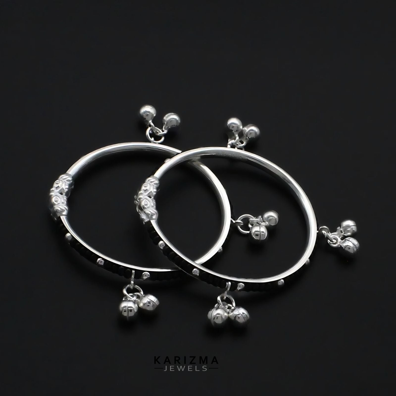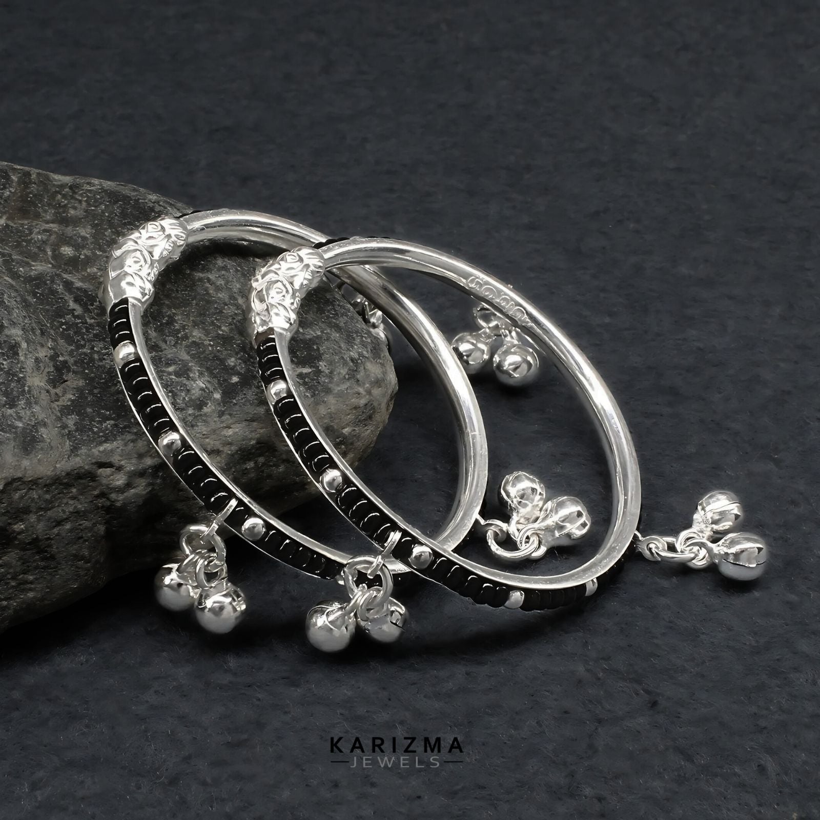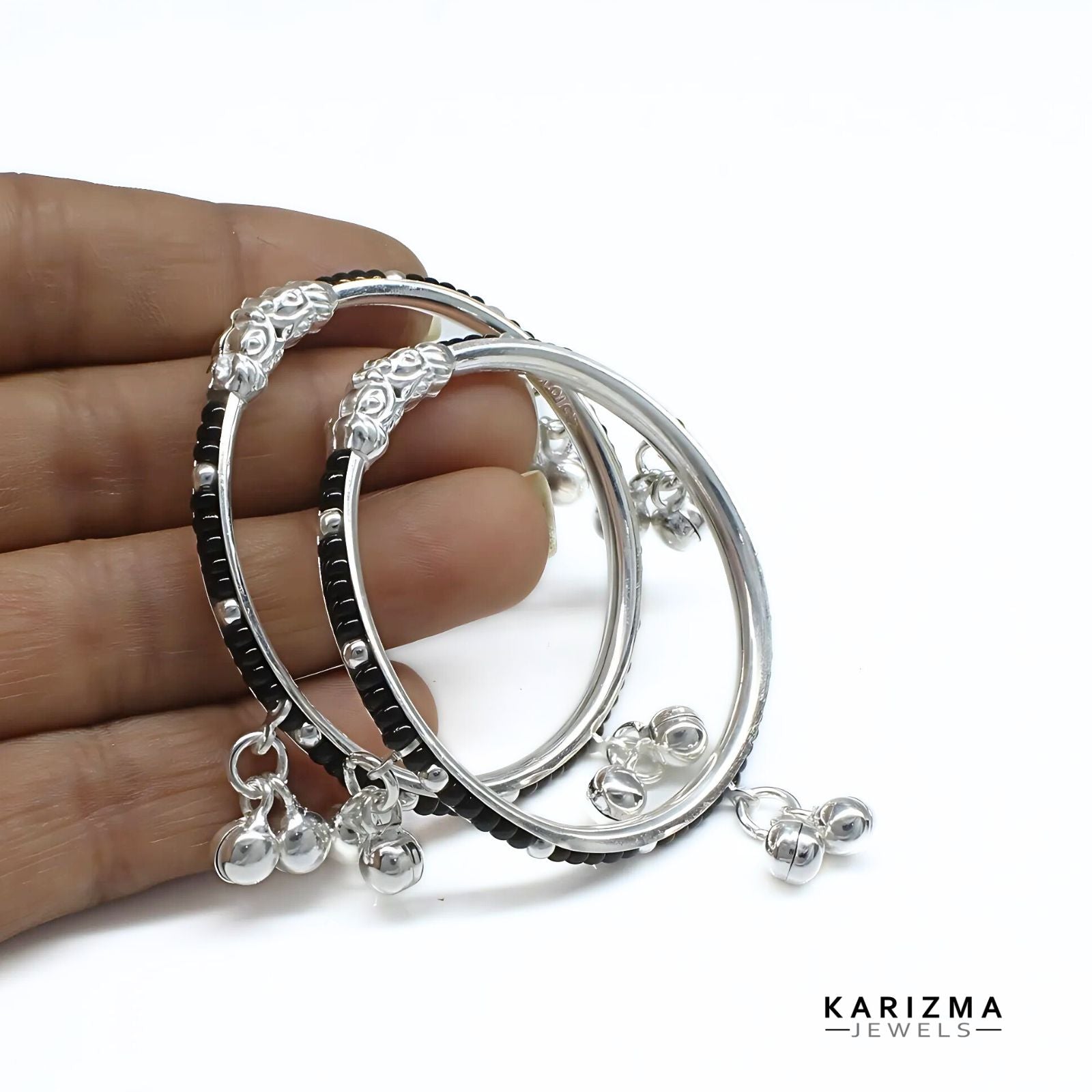 Real Silver Black Beads Nazariya kids Bangles Bracelet With Jingle Bells - Pair