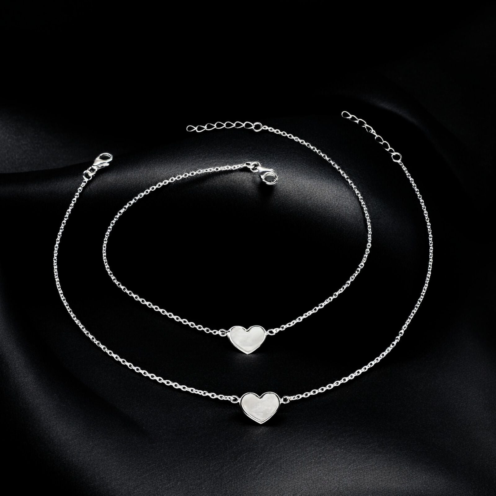 925 Sterling Silver girlish Dainty heart charm beach wear foot Anklet Pair 10.5"