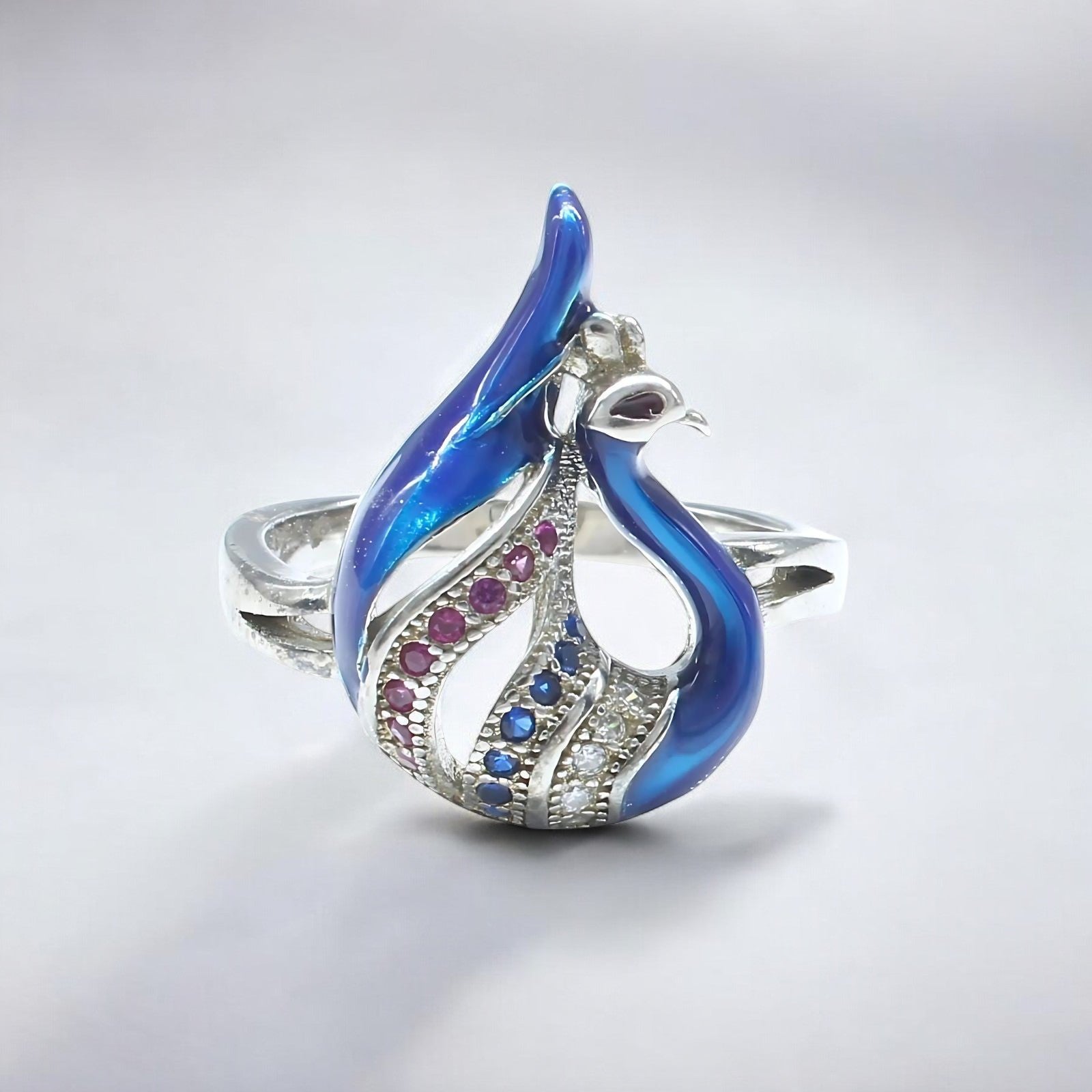 This handmade ring, crafted from genuine 925 sterling silver, showcases a stunning peacock-inspired design adorned with multiple sparkling cubic zirconia stones. Expertly crafted to highlight intricate details, it offers both durability and refined elegance. Ideal for women who value artisanal quality and distinctive style, this ring adds a graceful and eye-catching touch to any collection.