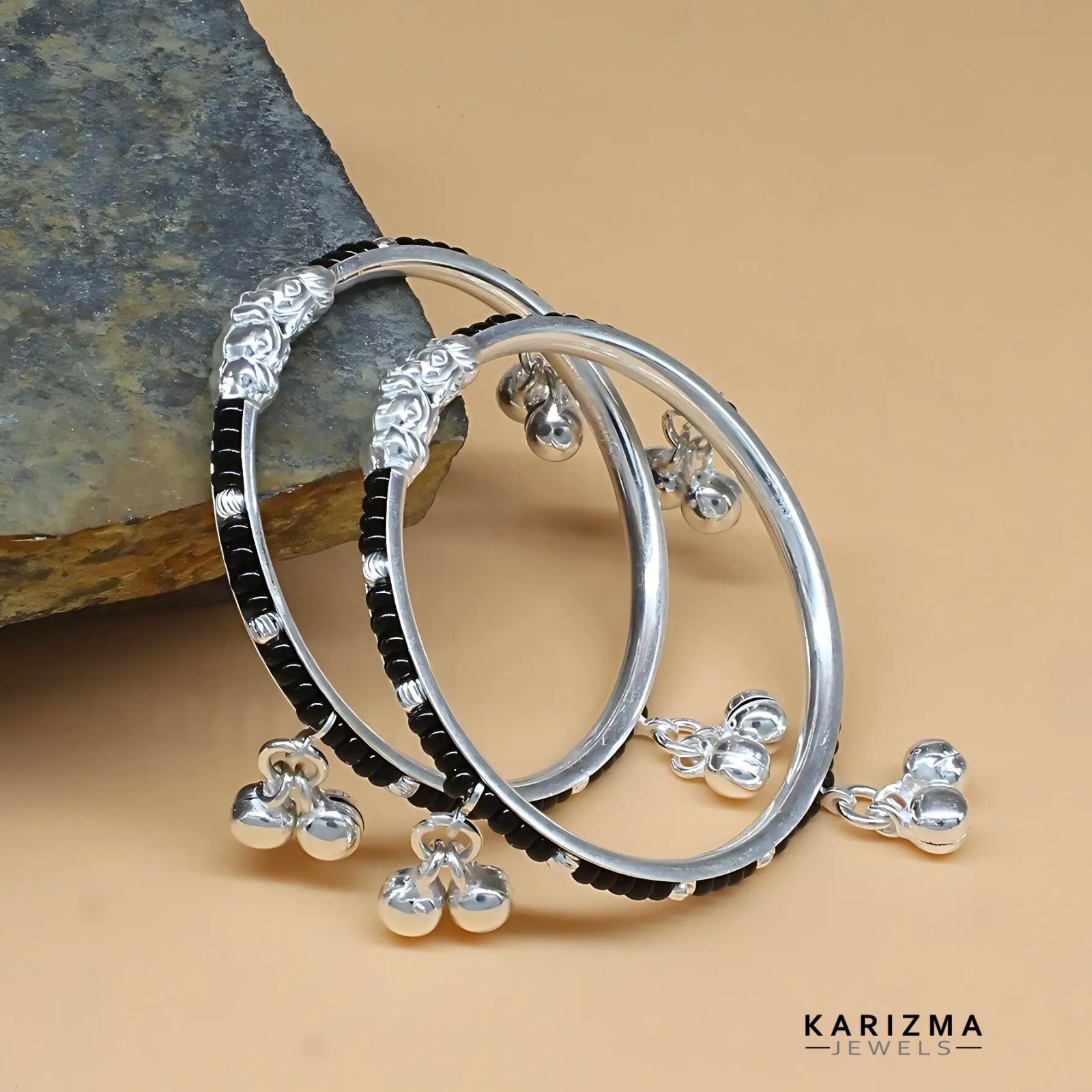 Real Silver handmade Black Beads Nazariya kids Bangles Bracelet With Jingle Bells - Pair