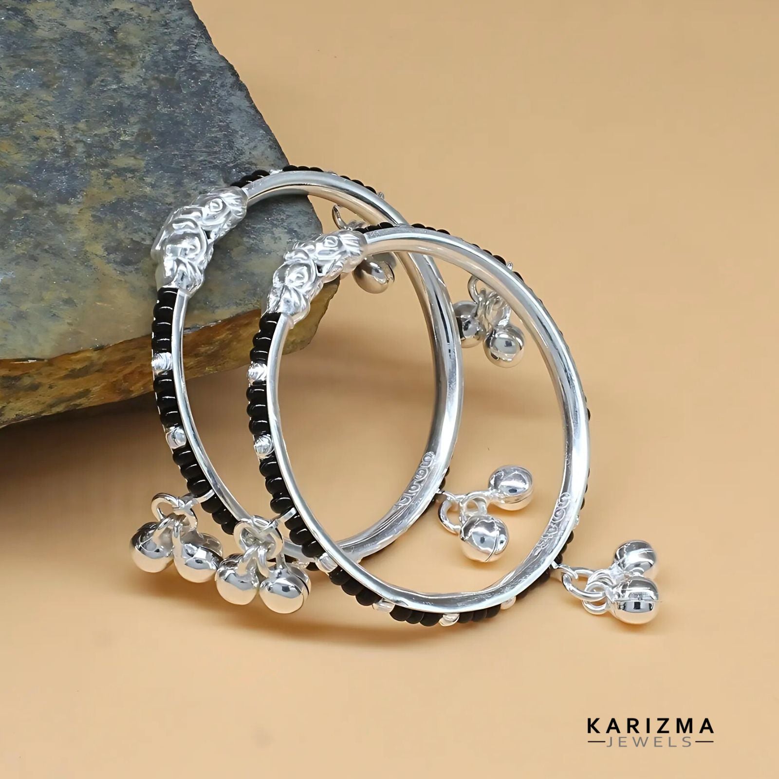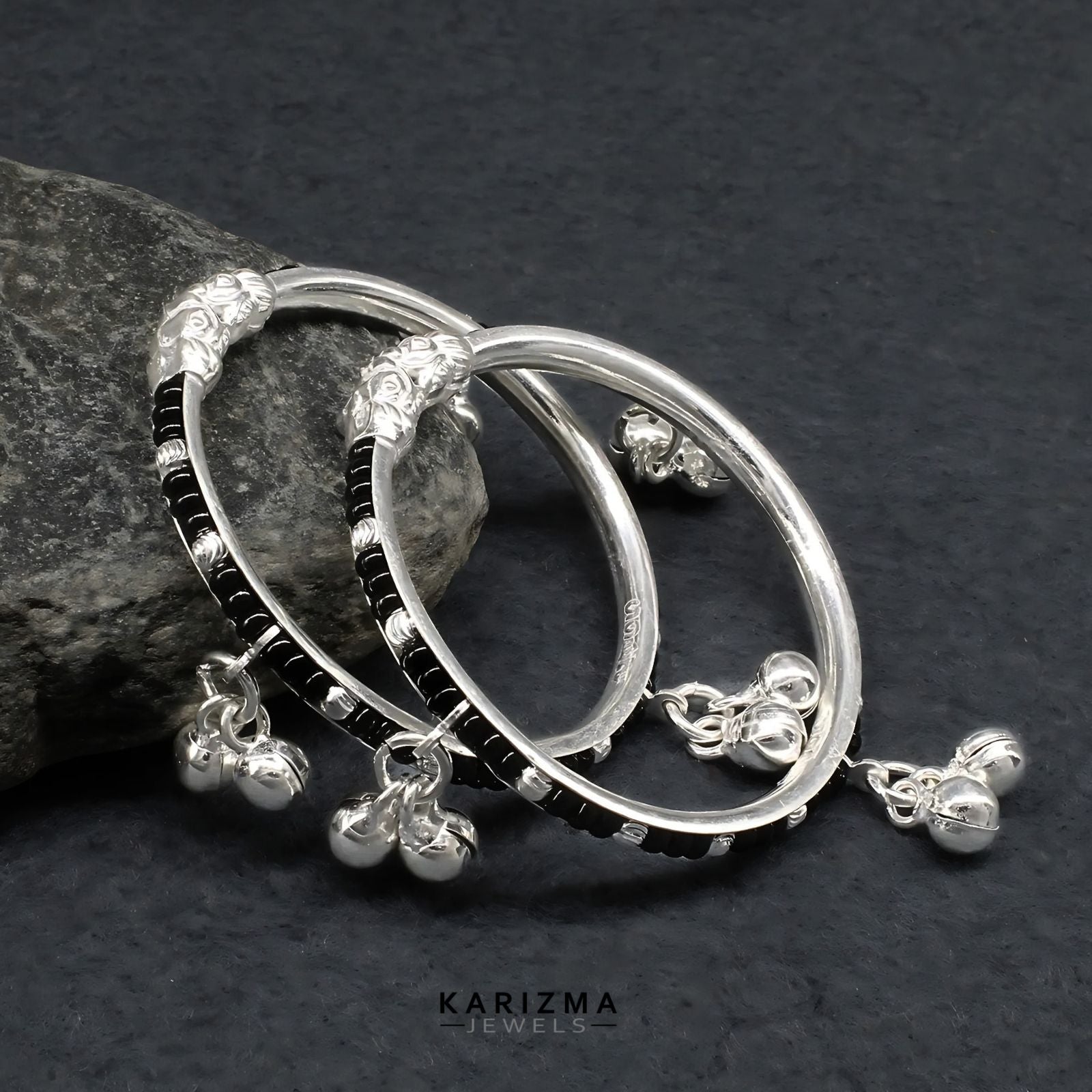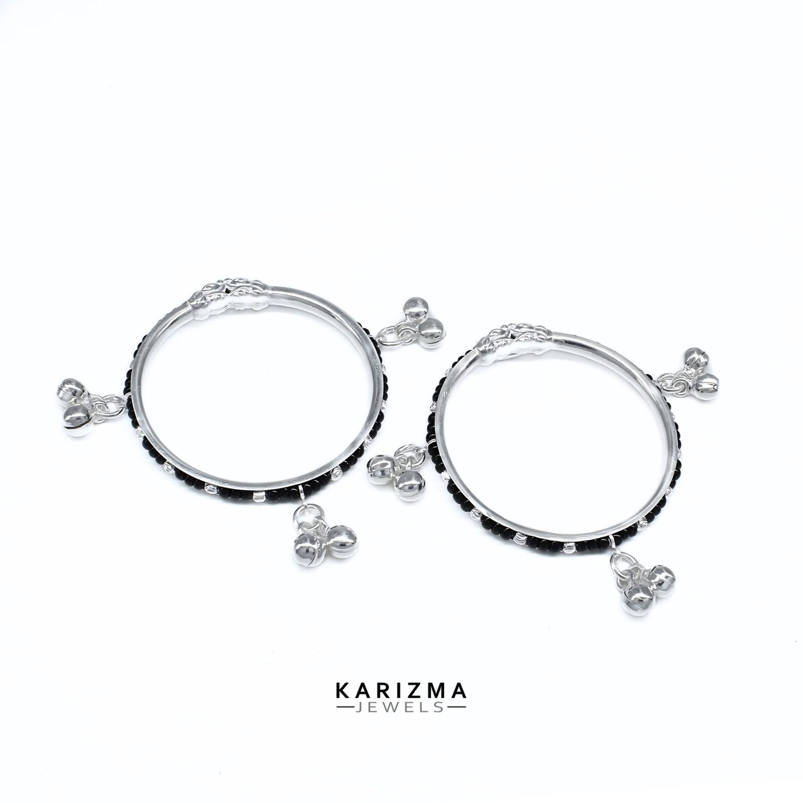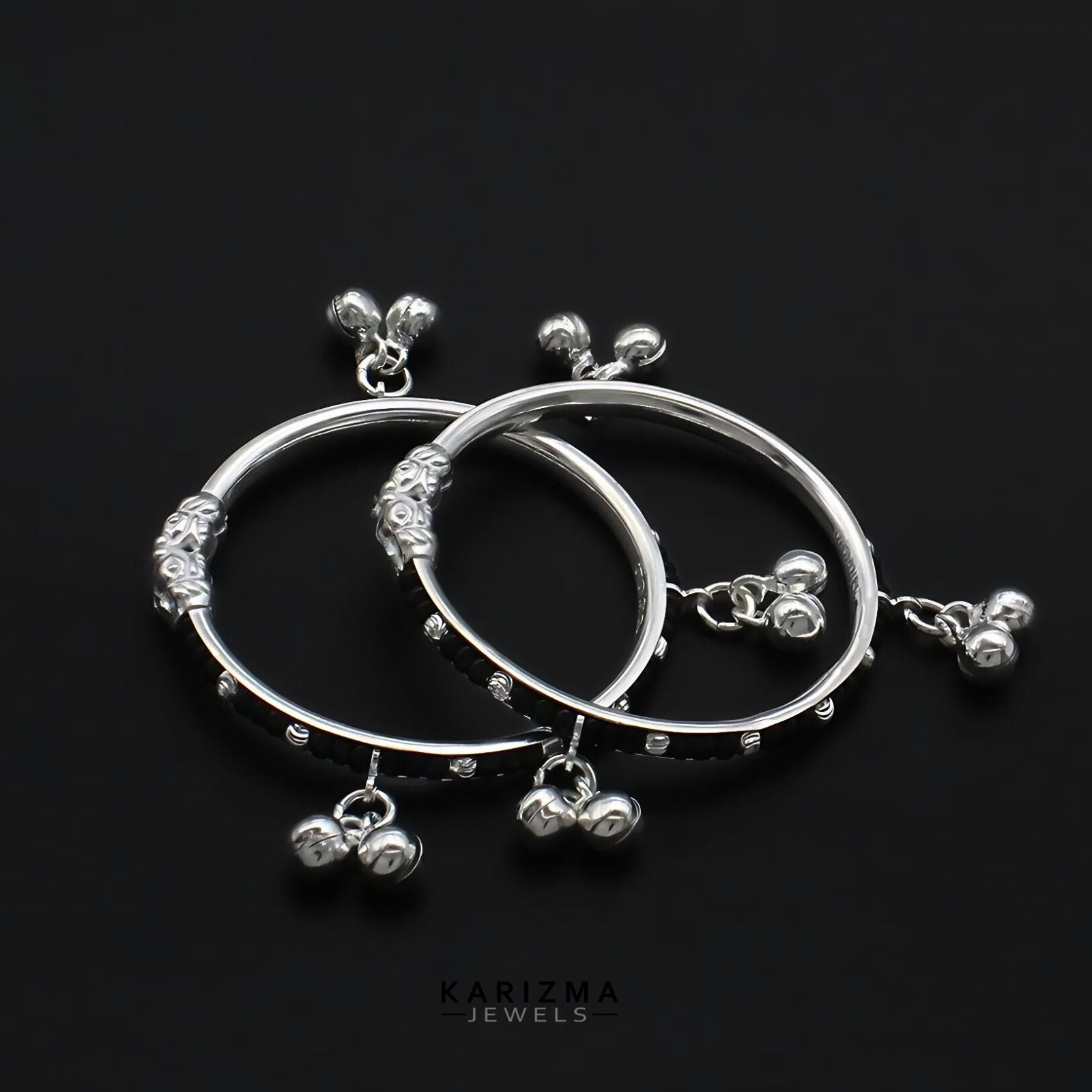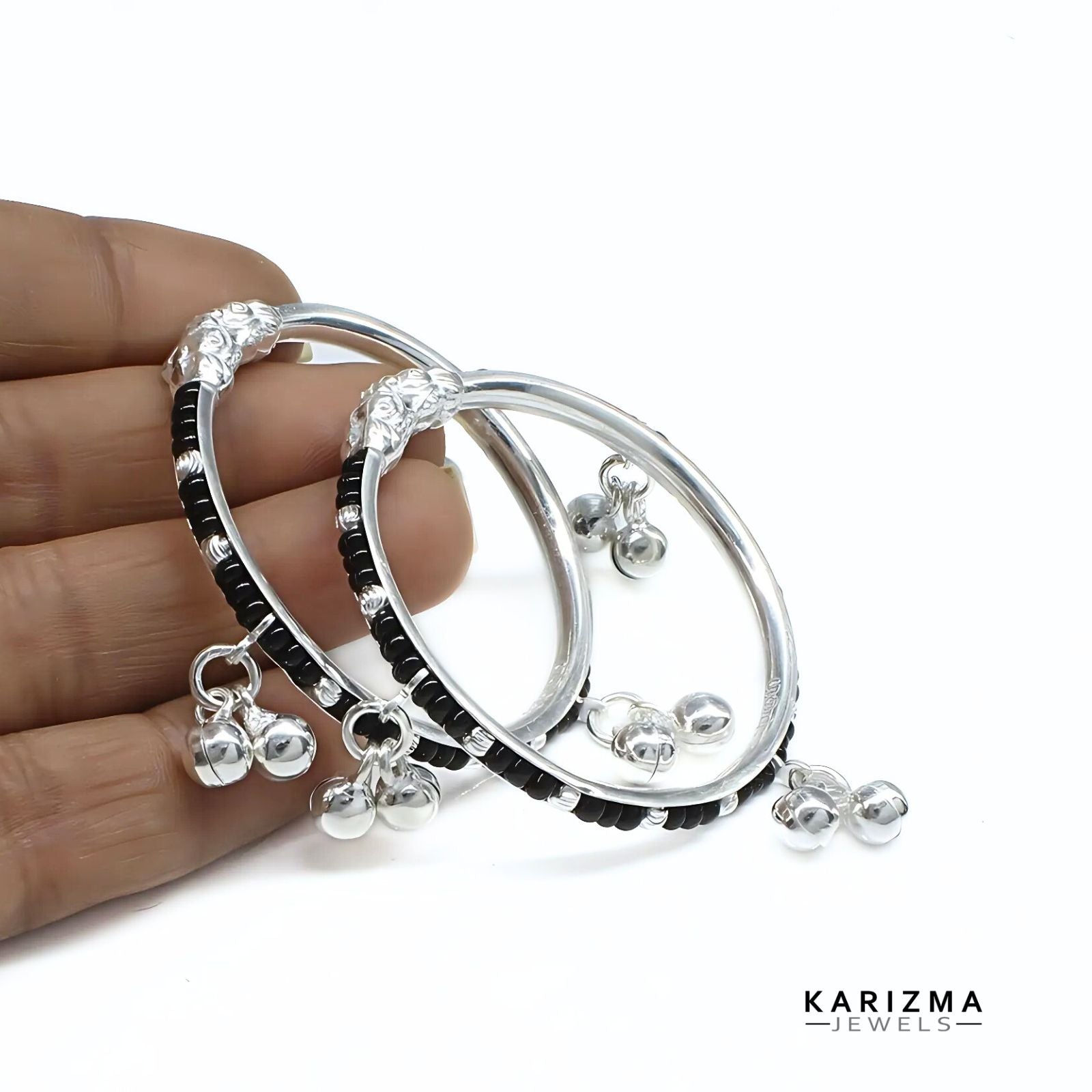 Cute Real Silver Black Beads Nazariya kids Bangles Bracelet With Jingle Bells - Pair