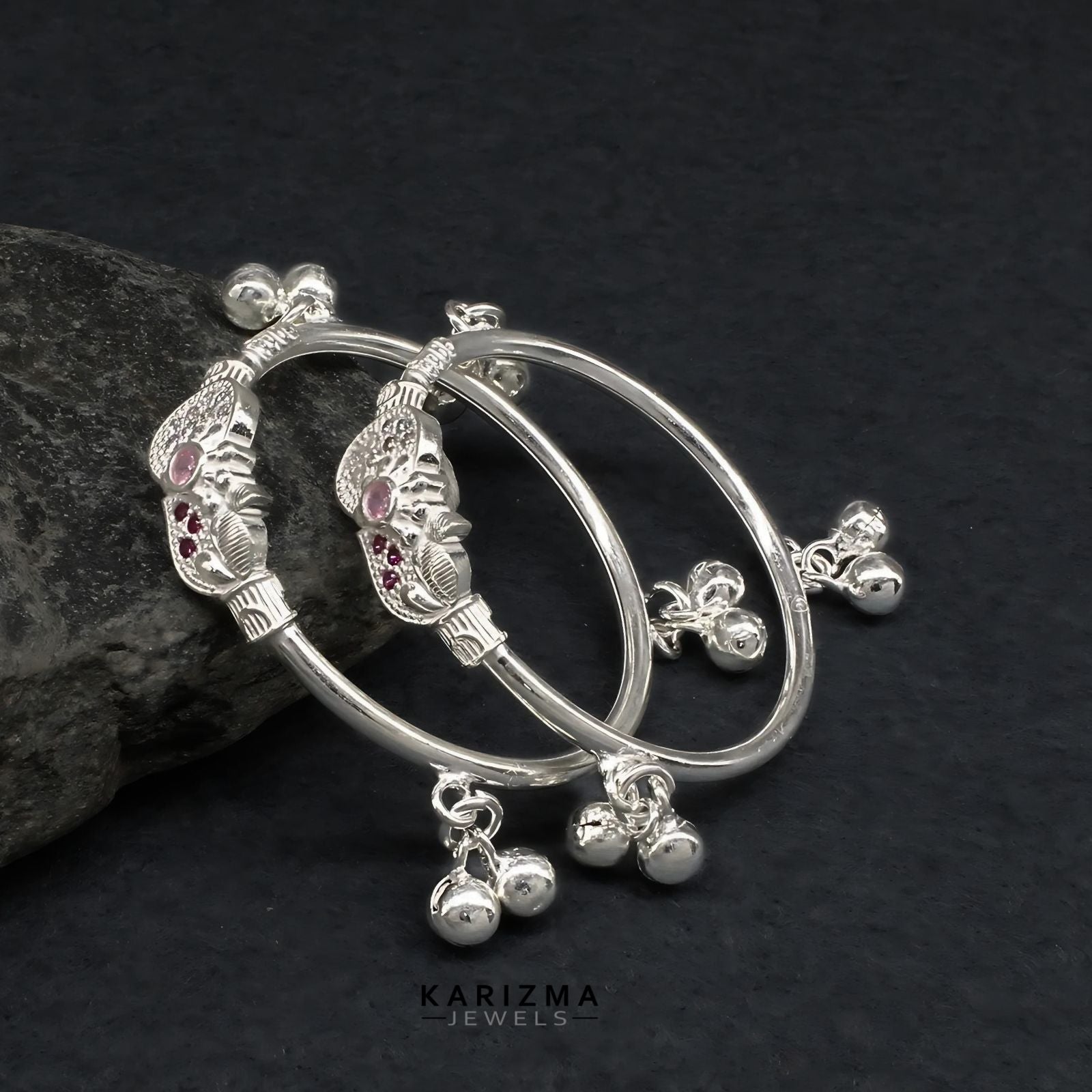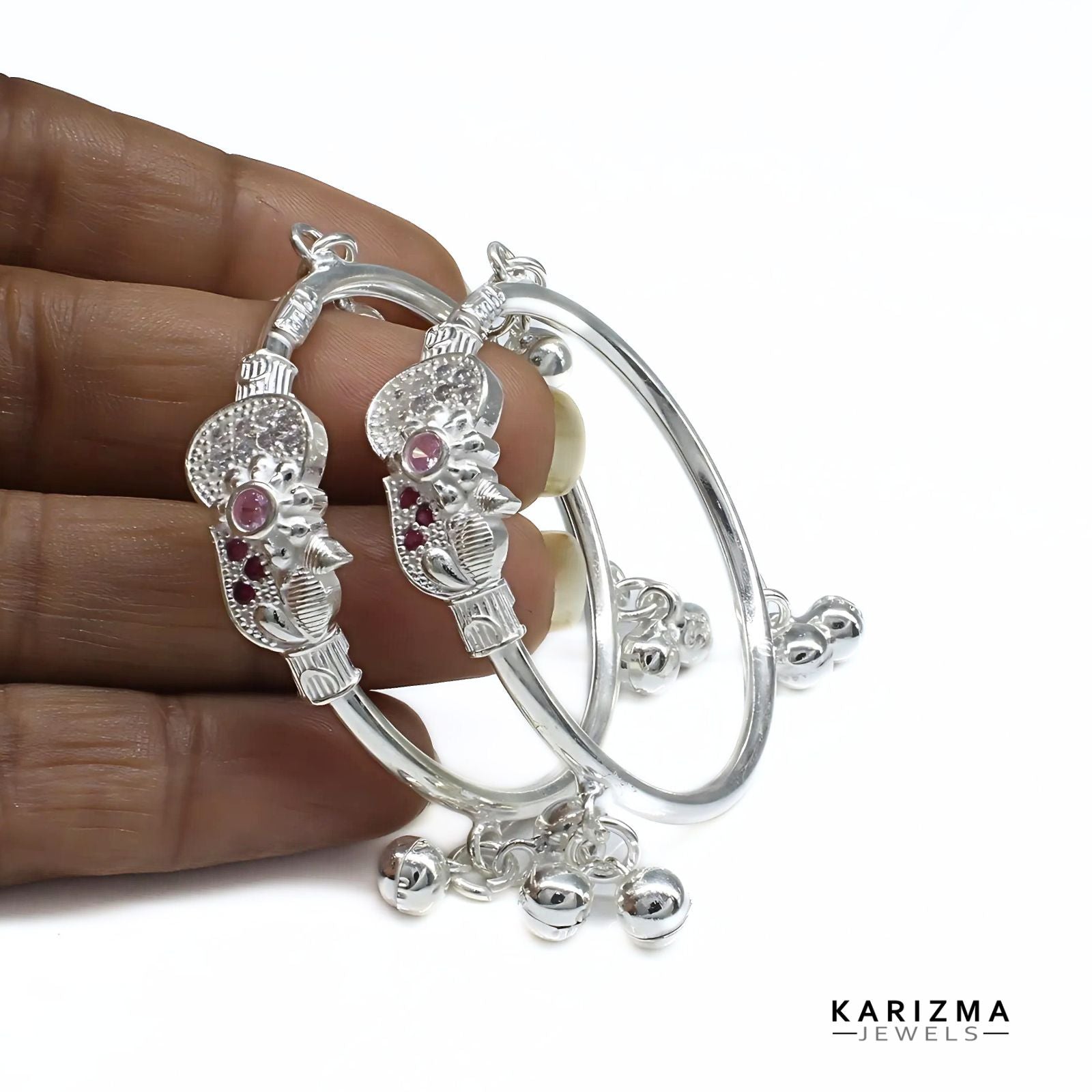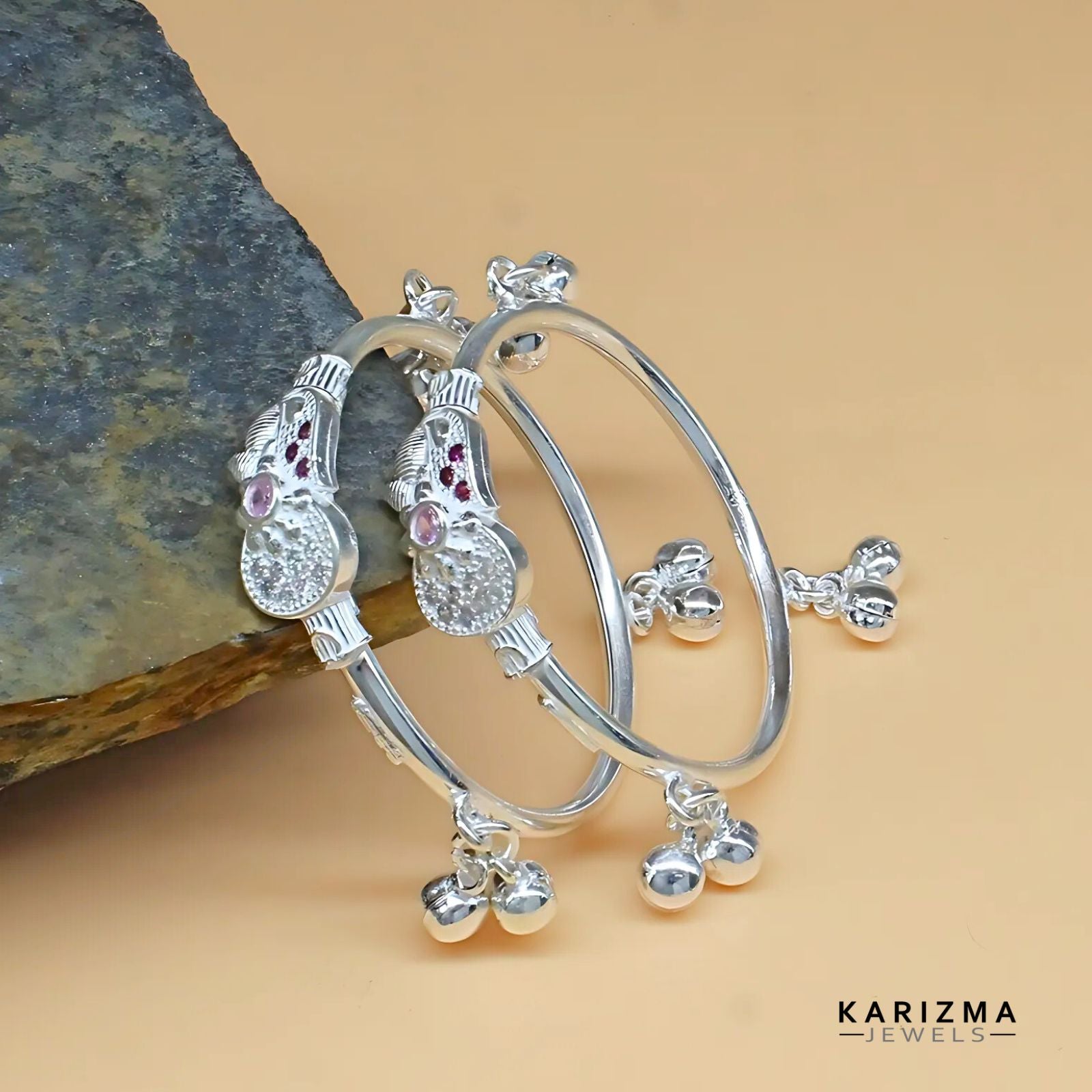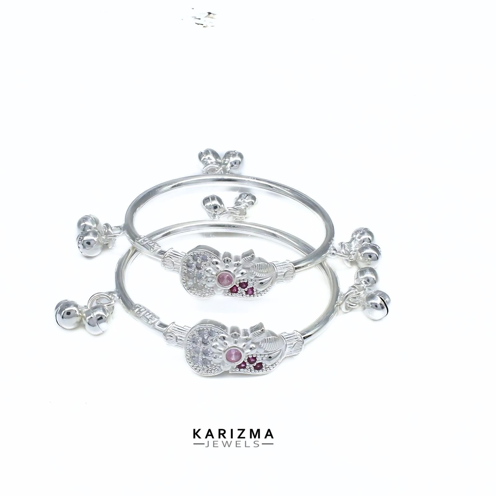 Crafted from real silver, this pair of bangles features a charming pink and white design with sparking CZ stones. The jingle bells add a playful touch, making it perfect for young girls. These bangles are a fun and stylish accessory that will delight any child and make them feel special.