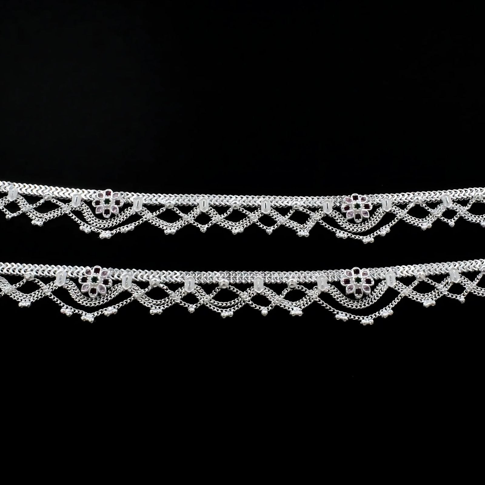 Elevate your footwear with this exquisite Sterling Silver Jhallar style anklet pair. Meticulously crafted with multiple CZ stones, these 10.3" anklets create a cascading effect that catches light with every step. The authentic sterling silver construction ensures durability while maintaining a lightweight feel for comfortable all-day wear. Perfect for traditional occasions or adding sophistication to casual outfits.