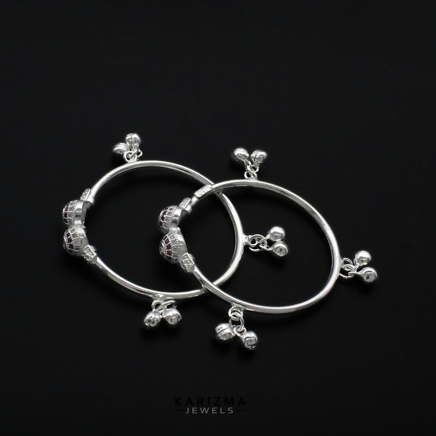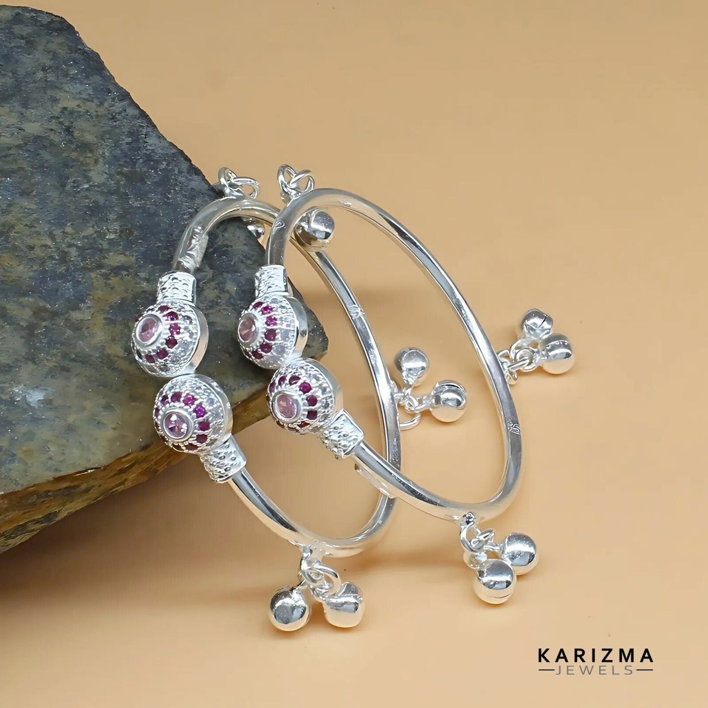 This pair of bangle bracelets are expertly crafted from Real Sterling Silver, adorned with Pink and White CZ stones, and accented with charming Jingle Bells. Perfect for kids, these bracelets add a touch of elegance and fun to any outfit. Made from high-quality materials, these bangles are both durable and stylish.