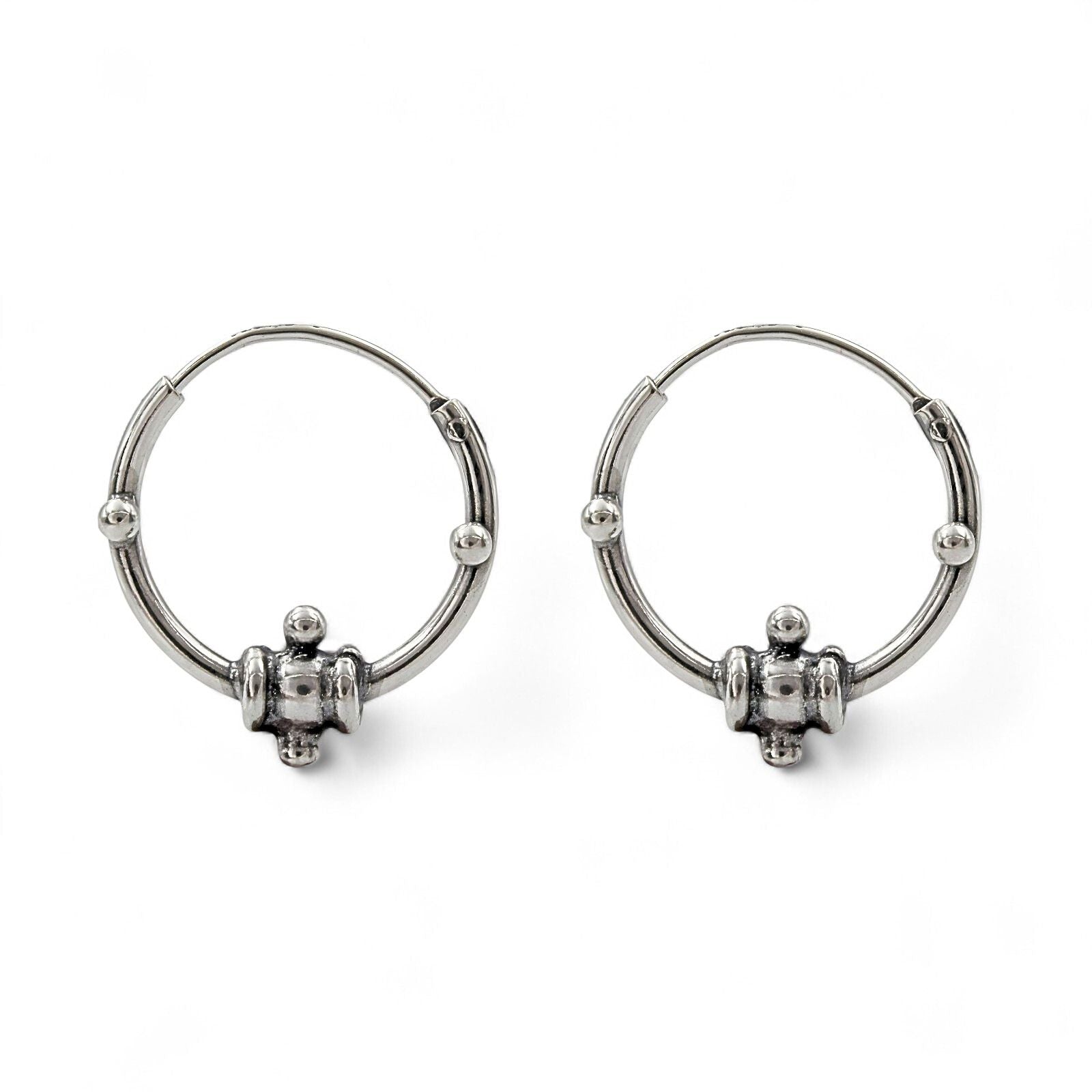 These bali hoop earrings feature genuine 925 sterling silver with an oxidized finish that creates a distinctive dark patina, enhancing their timeless appeal. The classic bali design showcases traditional craftsmanship with ornate detailing that catches light beautifully. Lightweight and comfortable for extended wear, they transition seamlessly from everyday elegance to special occasions. A versatile staple that complements both contemporary and traditional wardrobes with understated sophistication.