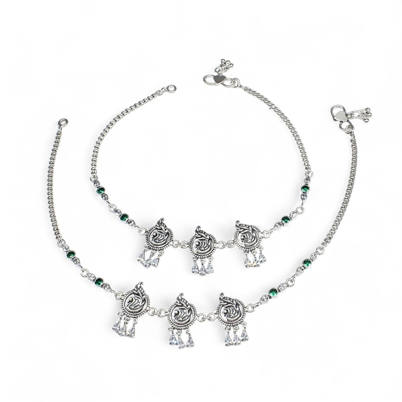 Traditional 925 Sterling Silver Green White CZ Oxidized Peacock design women payal Anklet Pair 10.3"
