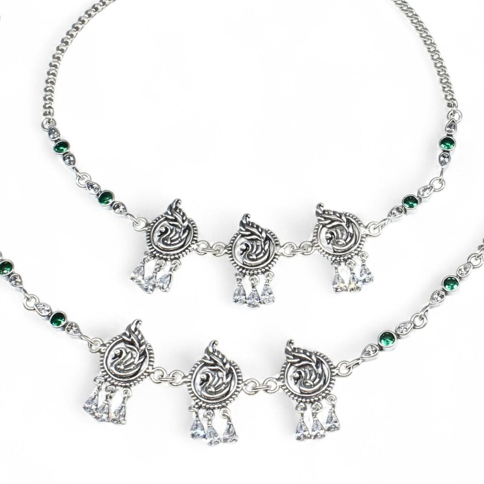 Celebrate heritage elegance with this refined pair of traditional payals, expertly crafted from 925 sterling silver. The peacock design showcases a harmonious blend of green and white cubic zirconia stones that create a mesmerizing interplay of color and luminosity. The oxidized finish imparts an authentic antique patina, enriching the peacock motif with sophisticated depth and character. At 10.3 inches, these anklets provide a comfortable, secure fit for extended wear. Perfect for festive occasions, weddings, or those who appreciate the timeless beauty of classical Indian jewelry, these payals exemplify superior artisanal craftsmanship and enduring style.